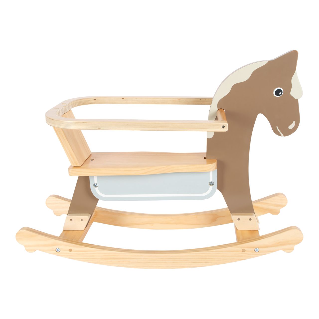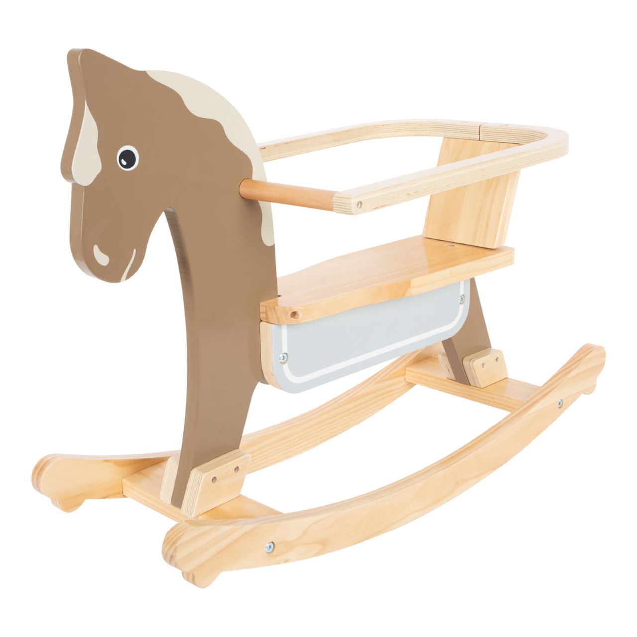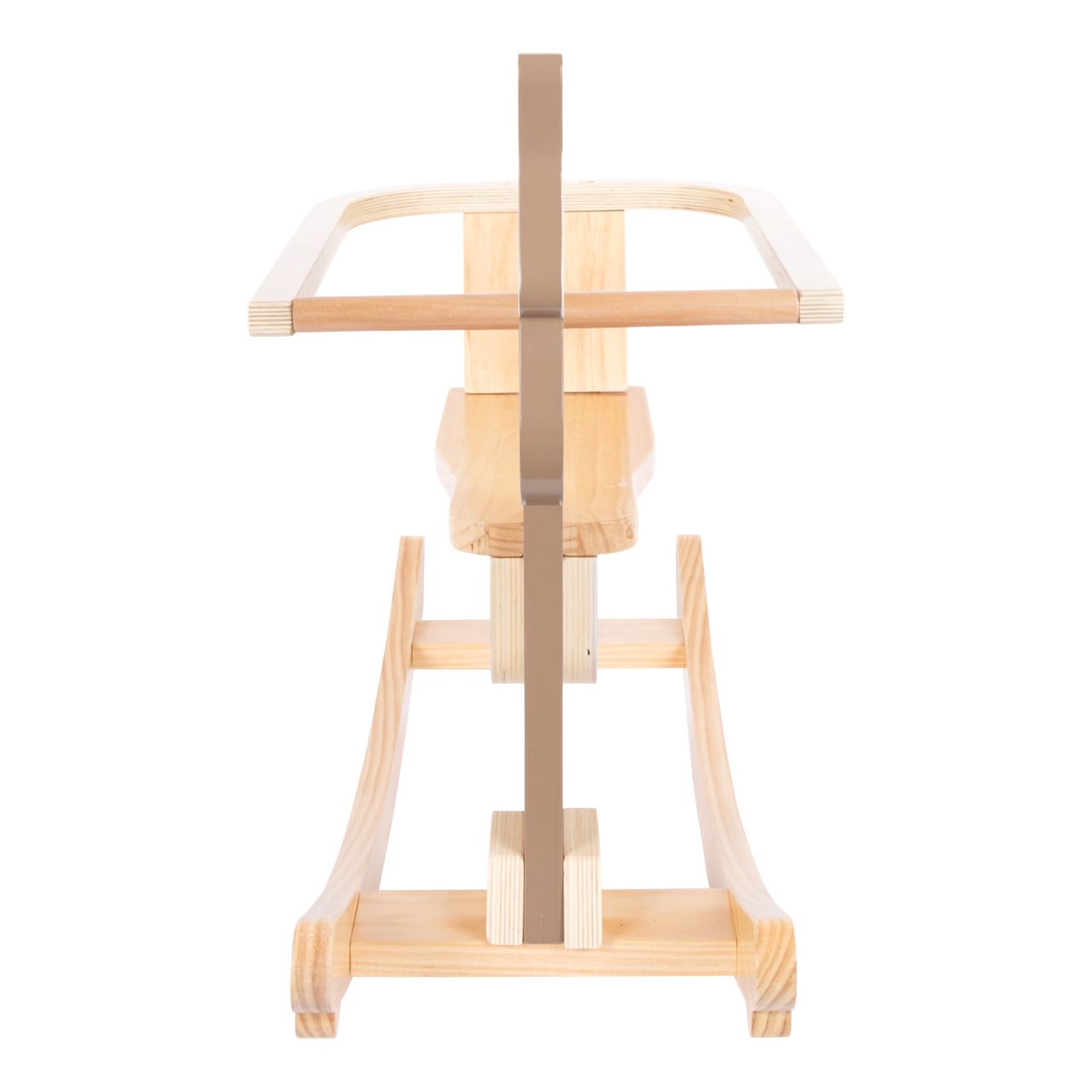 Vzhůru do sedel a cvalem kupředu! Houpací koník může dětem pomoci zesílit, rozvíjet koordinaci pohybů a rovnováhu. Pro zajištění maximální bezpečnosti je vybaven dorazy a opěradlem s hrazením, které lze snadno odejmout, jakmile dítě povyroste. Hračka je vyrobena z kombinace odolné překližky a masivního dřeva. Dává přitom vyniknout přírodním odstínům, a zútulní tak každý dětský pokojíček. Výrobek vyžaduje montáž, dodáváno s detailním návodem k sestavení.   Hlavní vlastnosti:opěradlo s hrazenímodolné dřevěné provedenívýška sedla 26 cmnosnost max. 50 kg