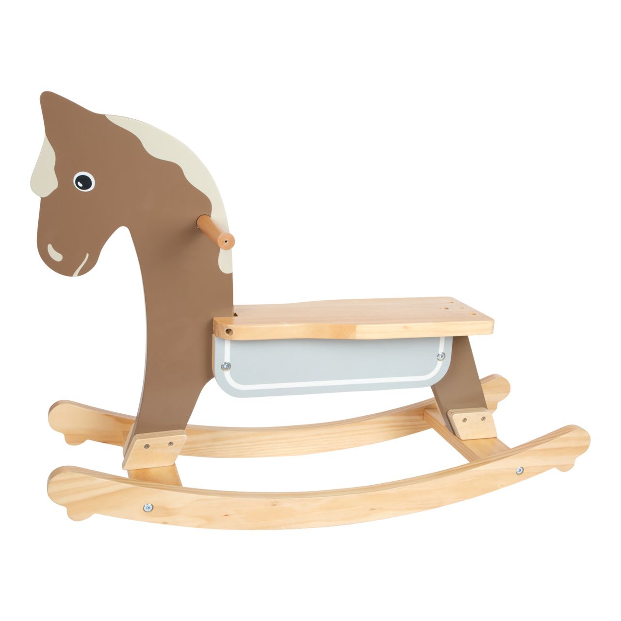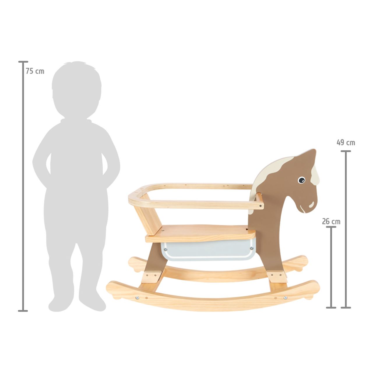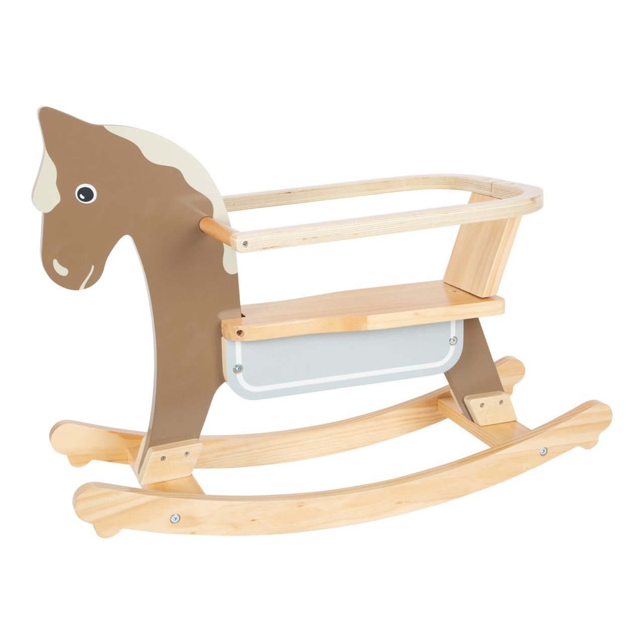 Vzhůru do sedel a cvalem kupředu! Houpací koník může dětem pomoci zesílit, rozvíjet koordinaci pohybů a rovnováhu. Pro zajištění maximální bezpečnosti je vybaven dorazy a opěradlem s hrazením, které lze snadno odejmout, jakmile dítě povyroste. Hračka je vyrobena z kombinace odolné překližky a masivního dřeva. Dává přitom vyniknout přírodním odstínům, a zútulní tak každý dětský pokojíček. Výrobek vyžaduje montáž, dodáváno s detailním návodem k sestavení.   Hlavní vlastnosti:opěradlo s hrazenímodolné dřevěné provedenívýška sedla 26 cmnosnost max. 50 kg