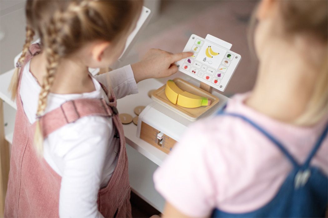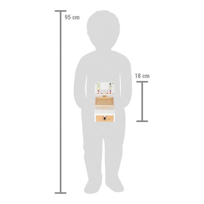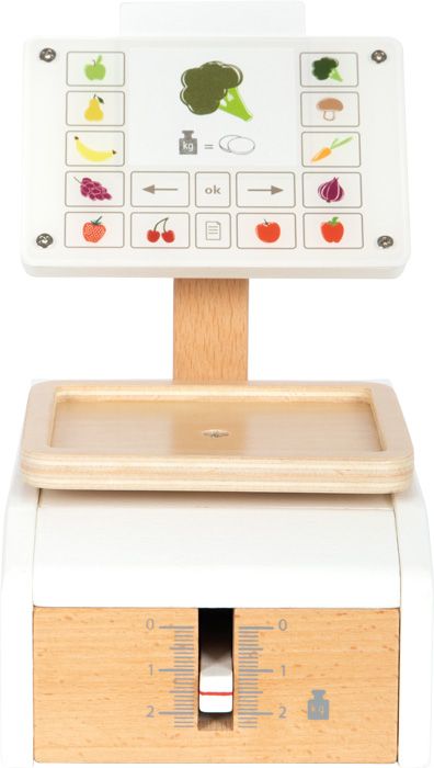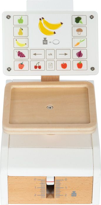 Važte ovoce a zeleninu jako v supermarketu. Tato dřevěná váha s velkou vážící plochou je tím pravým doplňkem pro vážení hracích potravin v obchodě, nebo v dětské kuchyňce. Integrovaný pružinový mechanismus zajišťuje obzvláště realistickou herní zábavu, protože pohyblivý ukazatel hmotnosti a vážicí miska se pohybují nahoru a dolů, když je něco položeno na váhu. Velký displej je vyroben z vysoce kvalitního akrylátového skla, který je potištěný ovládacími prvky a obrázky ovoce a zeleniny. Šest produktových karet potištěných na obou stranách s obrázky ovoce a zeleniny lze vložit shora do střední oblasti „displeje“. Tato váha z produktové řady „fresh“ je nutností v každém dobře zásobeném obchodě. Snadná ovladatelnost a jednoduchý mechanismus vážení umožňují dětem intuitivně porozumět procesu měření váhy. Aby děti pochopily různé ceny, jsou na kartách s jídlem obrázky mincí - čím více mincí je, tím dražší je vážené kilo ovoce nebo zeleniny. Vysoce kvalitní zpracování dřeva a akrylového skla dělá z váhy opravdový poutač v dětském pokoji, který slibuje dlouhotrvající zábavu. Manipulace s váhou trénuje také jemnou motoriku a koordinaci ruky a oka. Hlavní vlastnosti: váha s extra velkou vážicí miskou6 produktových karet potištěných na obou stranáchfunkční mechanismus, pohyblivý ukazatel hmotnostirozvíjí základní matematické a konceptuální dovednosti, jako je počítání a porovnávání hmotnostiproduktová řada „fresh“