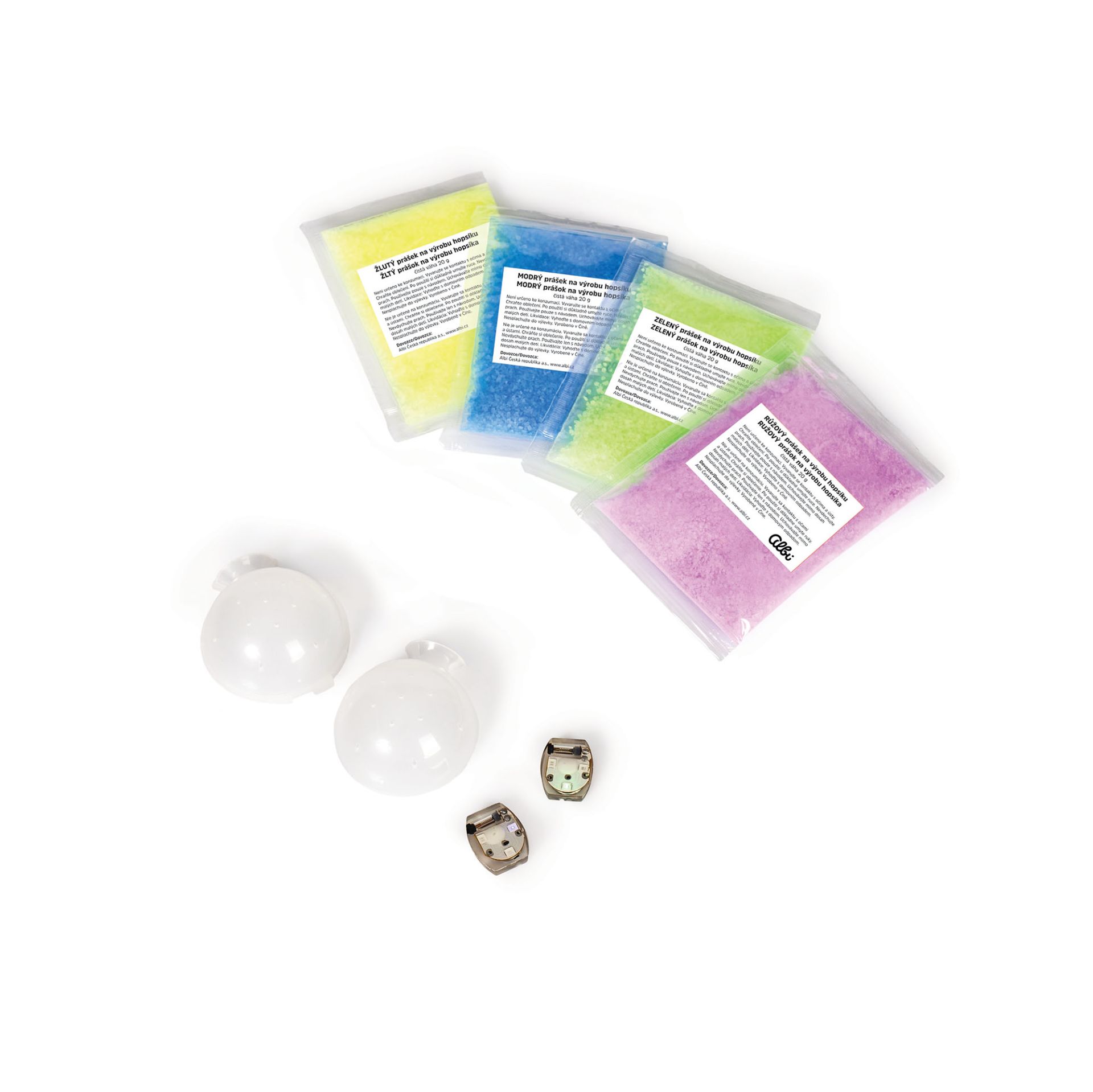 Malá vědecká sada v plechovce na vlastnoruční výrobu Svítících hopsíků z edice Albi Science. Pro děti od 6 let. Sada obsahuje: 1 sáček modrého prášku, 1 sáček růžového prášku, 1 sáček žlutého prášku, 1 sáček zeleného prášku, 1 formu a 2 blikátka s baterií.