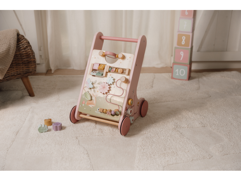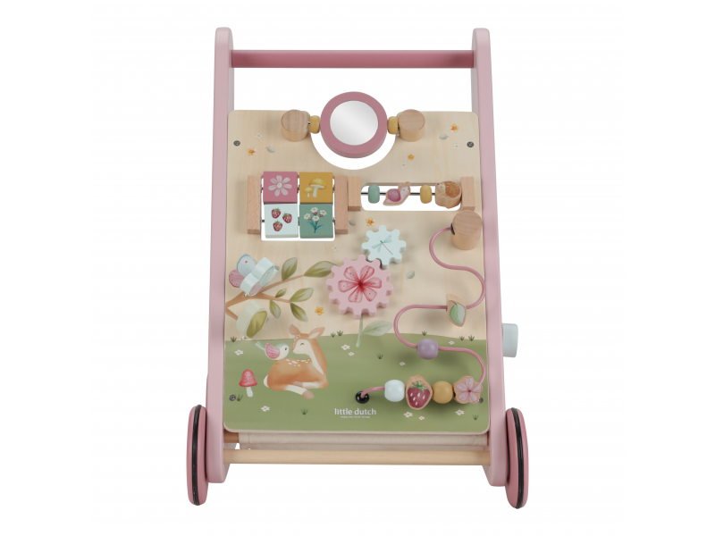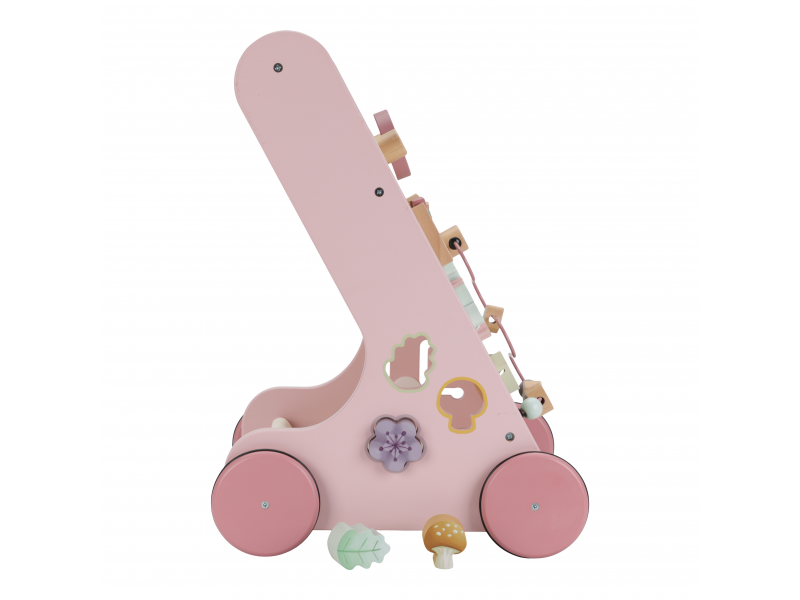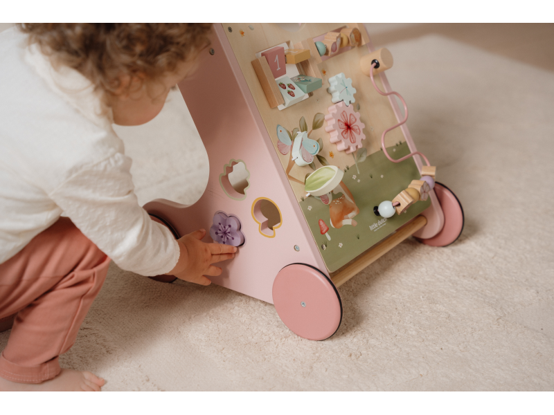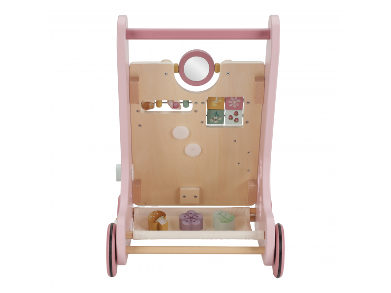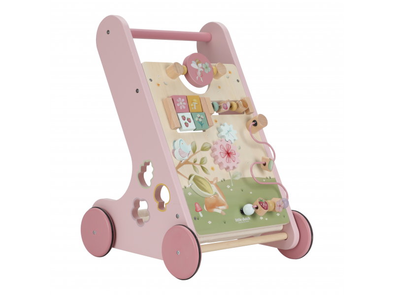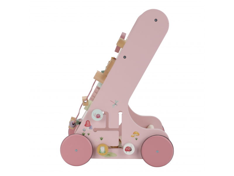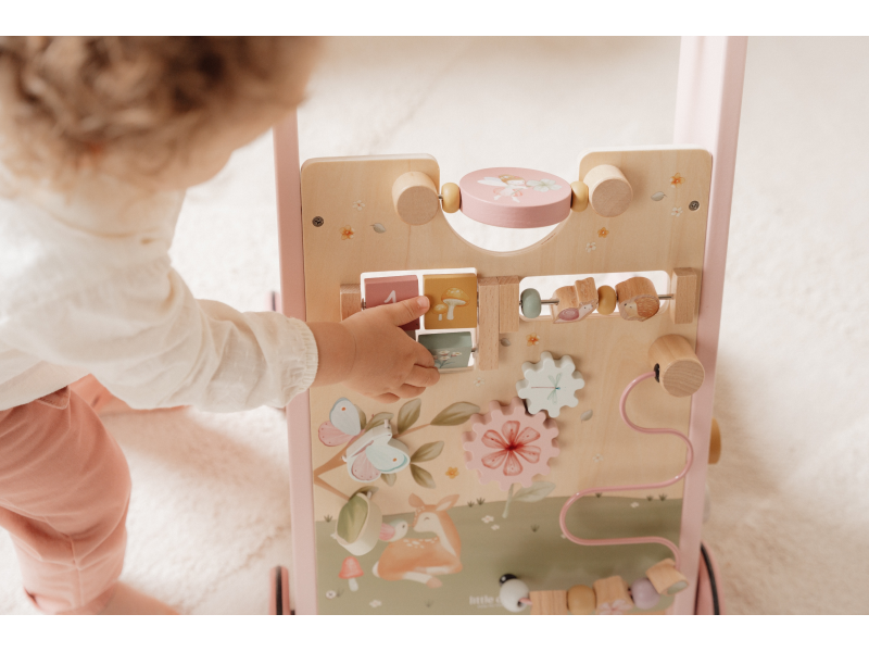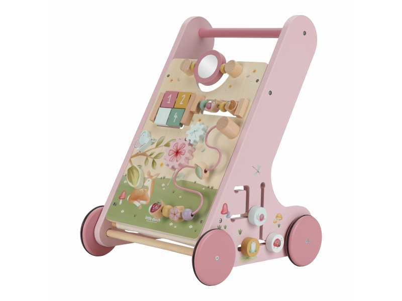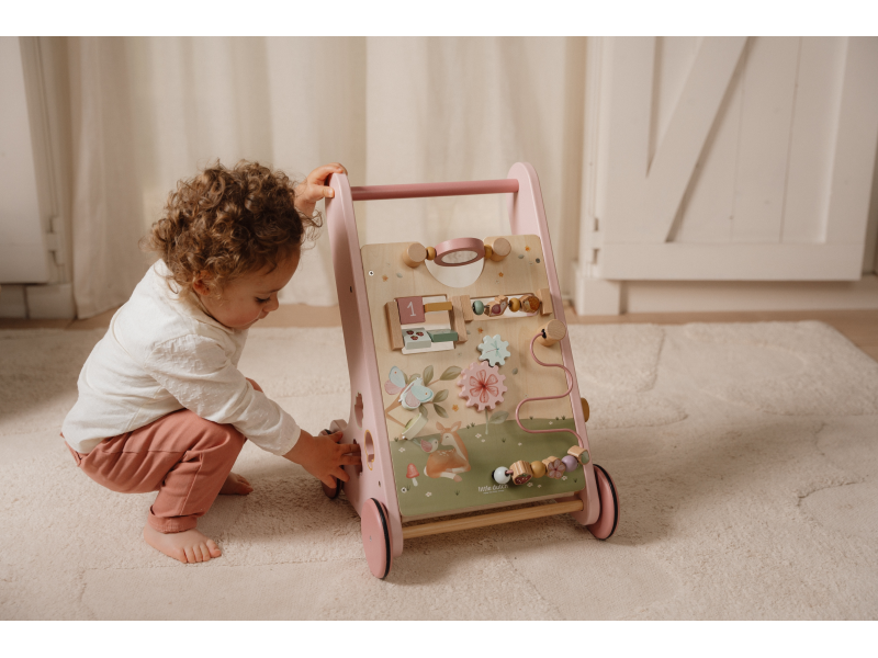 Dřevěné multifunkční chodítko se stabilní konstrukcí je ideální pro trénování chůze dětí od 12 měsíců, které jsou téměř připraveny učinit první kroky. Užijte si společně radostné okamžiky, když vaše dítě poprvé přejde celou místnost! Chodítko zároveň nabízí řadu zajímavých aktivit pro zkoumání a pozorování. Pohyblivé a otáčivé části s s krásnými ilustracemi motivů ze života na zahradě dítě zabaví a zároveň podporují rozvoj jeho motorických dovedností. Gumová kolečka nebudou dělat žádné stopy na podlaze a jsou bezpečná pro použití v interiéru. Chodítko je součástí designové kolekce hraček a doplňků Little Dutch Fairy Garden inspirované životem na zahradě. Vyrobeno z dřeva certifikovaného FSC. Rozměry: 32,5 x 35,5 x 49 cm Vhodné pro děti od 12 měsíců.