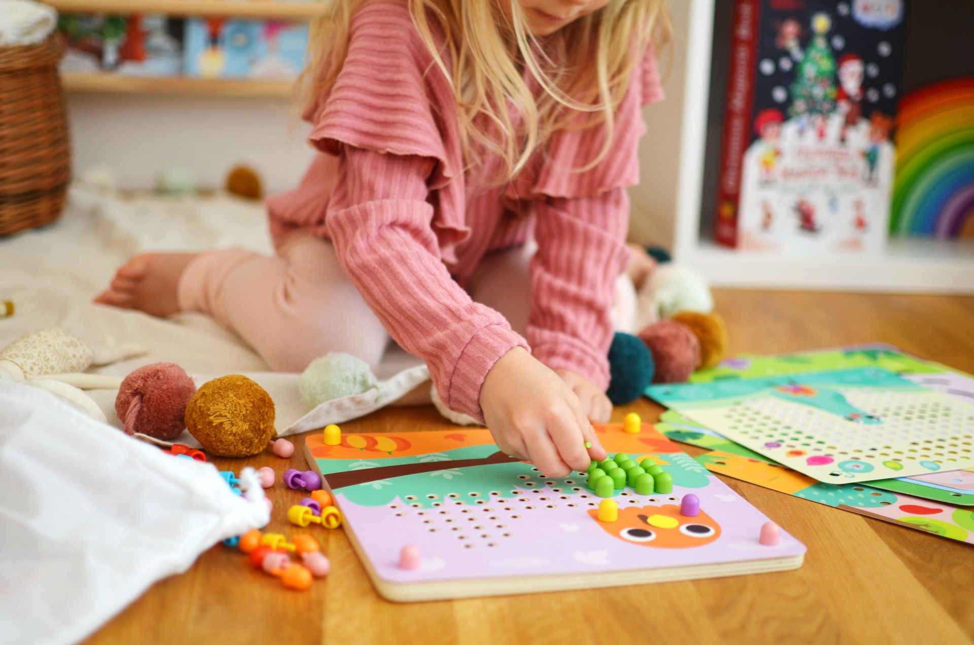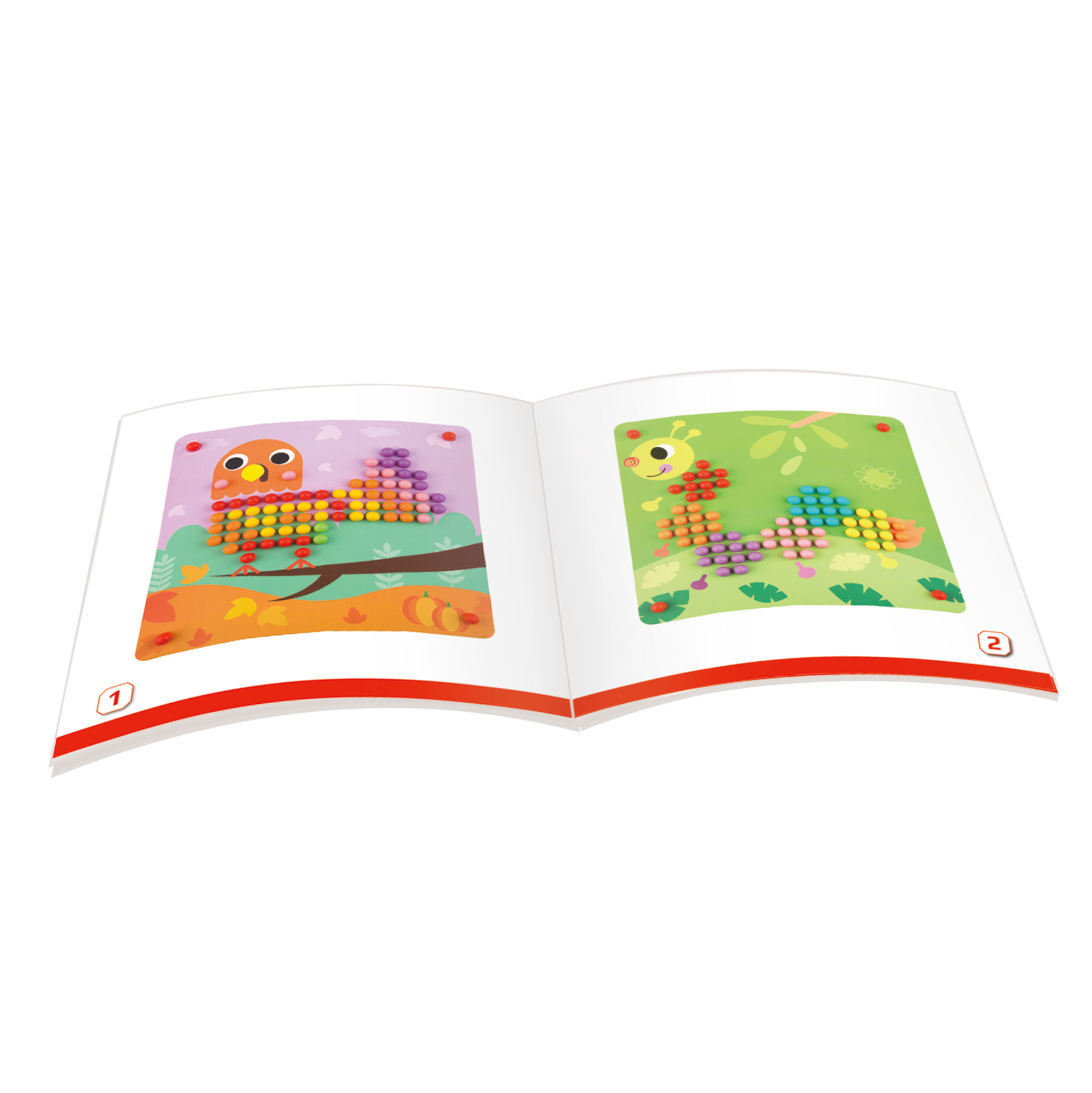 Prvá spoločenská hra - malá mozaika Malá mozaika s obrázkami zvieratiek rozvíja detskú kreativitu.Vkladaj malé farebné hríbiky do dierok na doske a dotvor si zvieratko podľa ľubovôle. Dieťatku pomáhajú pri tvorbe mozaiky jednotlivé predlohy, ale môžu tiež popustiť uzdu svojej fantázii. Detičky si zlepšujú jemnú motoriku.Vďaka práci s malými hríbikmi si detské ruky cibria svoj úchop. Hríbiky ale tiež môžu počítať alebo si ich triediť podľa farieb. V balení nájdete umelohmotné farebné hríbiky a 10 mozaikových predlôh zvieratiek. Deti od 3 rokov tak majú dostatok priestoru na svoj rozvoj.