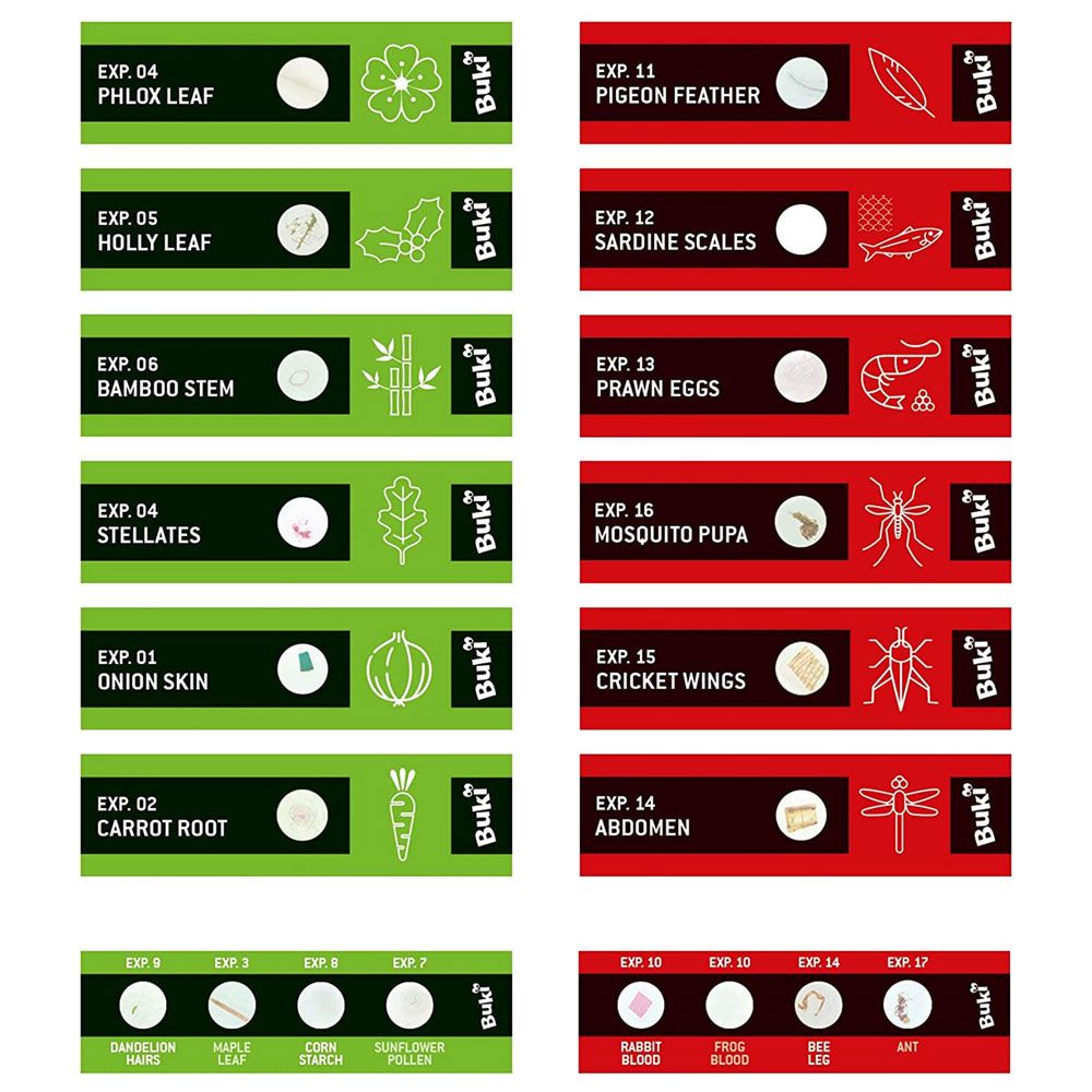 Preparáty pre mikroskop 20 ksSada 20 preparátov pre mikroskopy BUKI a nielen tieSada obsahuje 20 preparátov, ktoré sú určené pre mikroskopy BUKI. Sú to skvelé doplnky na objavovanie mikrosveta okolo nás. S touto sadou sa každý stane malým vedcom. Obsah sady:šupka cibulekoreň mrkvyjavorový listiné listylist cezmínybambuspeľ slnečnicekukuričný škrobplod púpavy lekárskejkrvpero holubašupina sardinkyvajíčko krevetyhmyzkrídlo kobylkykukla komáramravec