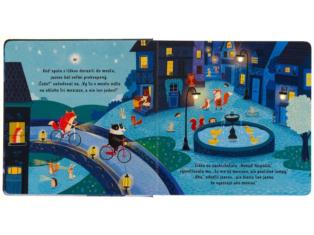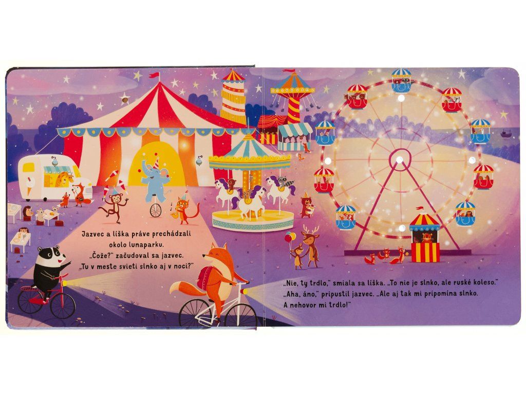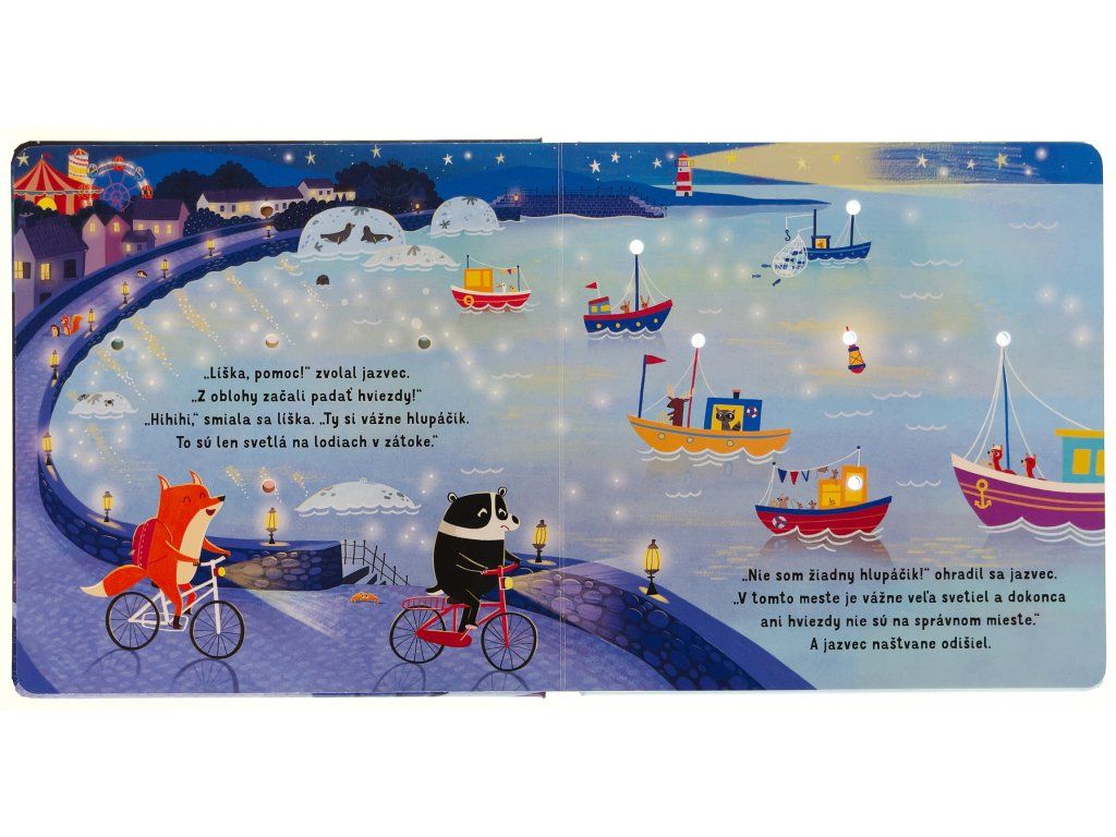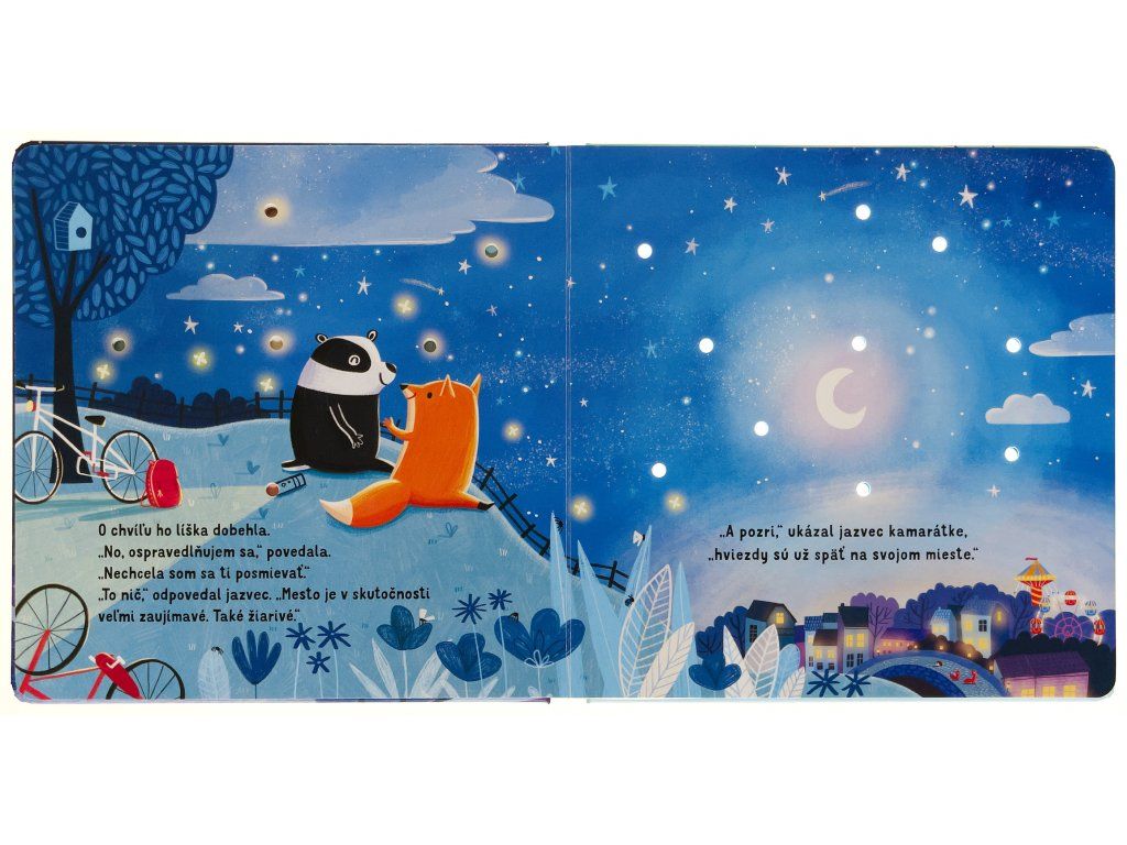 Dobrú noc - kniha so svetielkamiRozžiar líške a jazvecovi nočné mesto!Zababušte sa do perín a spoločne sa vydajte na malé nočné dobrodružstvo do mesta s jazvecom a líškou v sprievode desiatich trblietavých svetielok. Stačí stlačiť tlačidlo a na stránkach zasvietia hviezdy na nočnej oblohe.Toto milé spoločné čítanie na dobrú noc vám aj vašim deťom predstaví príbeh o kamarátoch jazvecovi a líške. Líška jedného večera ponúkne jazvecovi, že mu ukáže mesto, svoj domov, ktoré sa pomaly ponára do tmy. Jazvec, zvyknutý na les, je veľmi prekvapený nočným mestom a nestačí sa diviť, ako žiarivé a rušné vie tak neskoro byť. Nechajte sa s vašimi najmenšími touto roztomilou knihou o priateľstve pomaly ukolísať do spánku v sprievode svetielok, ktoré na stránkach žiaria ako hviezdy na nočnej oblohe. 》Pozrite si recenziu na našom Instagrame - Dobrú noc《