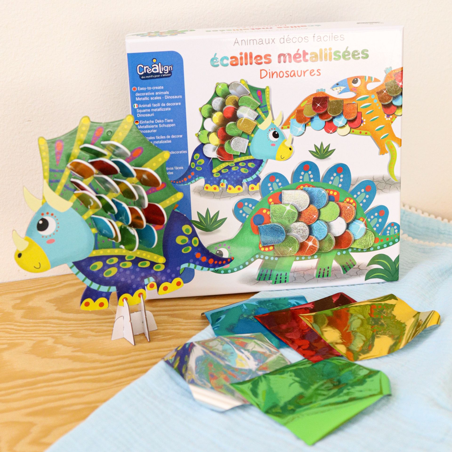 Tvorenie so šupinami Dinosaury 3+ Vytvor si lesklé dinosaurami!Kreatívna súprava pre deti Tvorenie so šupinami Dinosaury od francúzskej značky Crea Lign z radu Jednoduché obrázky je vhodná už pre deti od 3 rokov. Obsahuje 3 dinosaurami z tvrdého kartónu, 64 šupín na nalepenie a 6 hárkov s metalickými farbami. Vďaka nim si deti dinosaurami jednoducho dotvoria a vzniknú im originálne 3D obrázky, ktoré si zavesia na stenu. S Crea Lign sa deti učia nové umelecké technikyDeti najskôr odlepia šupinu, položia ju na papier s metalickou farbou, kde získa svoj jedinečný lesk, následne ju nalepia na obrázok. Súprava podporuje rozvoj jemnej motoriky, predstavivosti i kreativity. Produkt je vysoko kvalitný a bezpečný, rovnako ako všetky ostatné výrobky francúzskej značky Crea Lign.