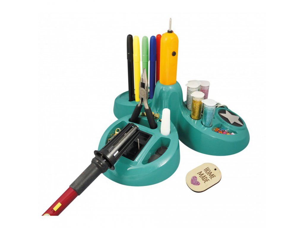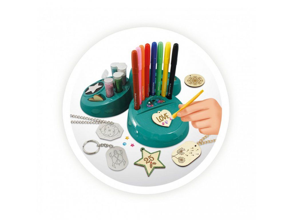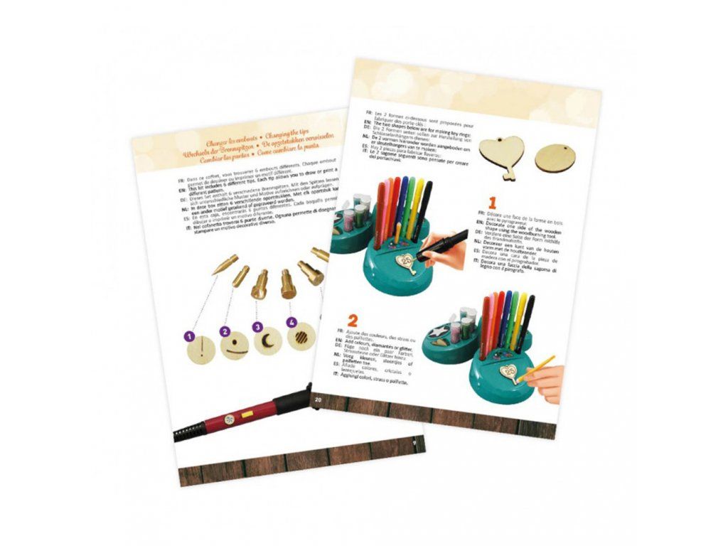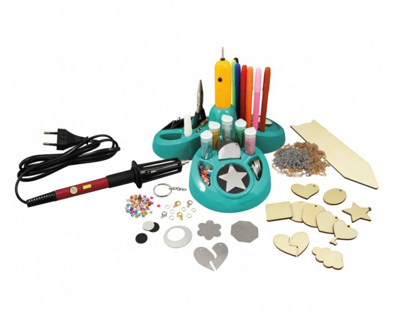 Profesionálne gravírovacie štúdioBezpečná dielňa na vypaľovanie do dreva a kovu. Navrhnite a vyrobte 5 magnetiek, 5 kľúčeniek, 10 náhrdelníkov a 1 záložku do knihy. Nástroj na pálenie dreva je vybavený ochranou proti popáleniu prstov, termostatom na udržiavanie požadovanej teploty a vypínačom. Dospelá osoba môže pomôcť vymeniť jeden zo šiestich hrotov.Súčasťou sady je tiež nástroj na gravírovanie vzorov do kovových doštičiek, ktoré je možné následne premeniť na šperky alebo kľúčenky. Balenie obsahuje aj rôzne doplnky na zdobenie výrobkov: plstené špičky, trblietky, diamanty, lepidlo, pinzetu, kovové a drevené podkladové materiály rôznych tvarov, retiazky, krúžky, spony atď.Vypaľovačka do dreva je napájaná zo siete a rytec na kov vyžaduje 2 batérie typu LR06, ktoré nie sú súčasťou dodávky. Tu nájdete návod