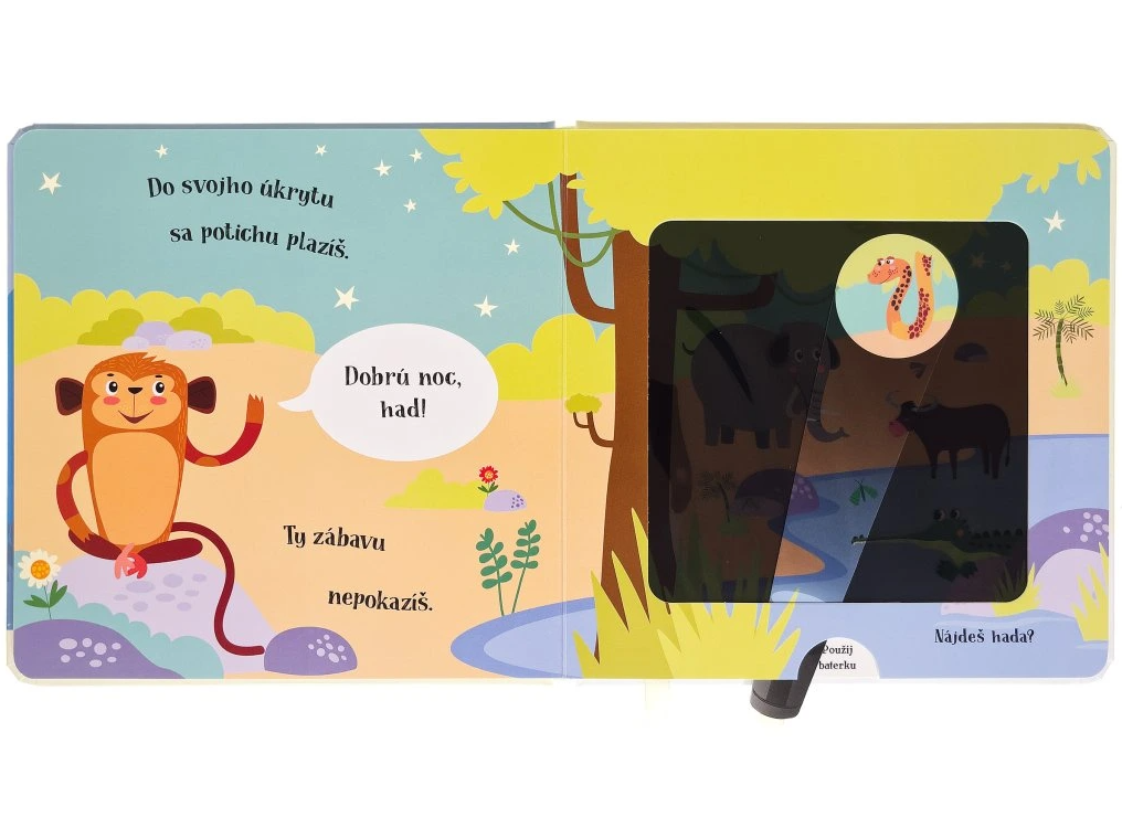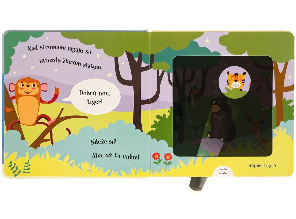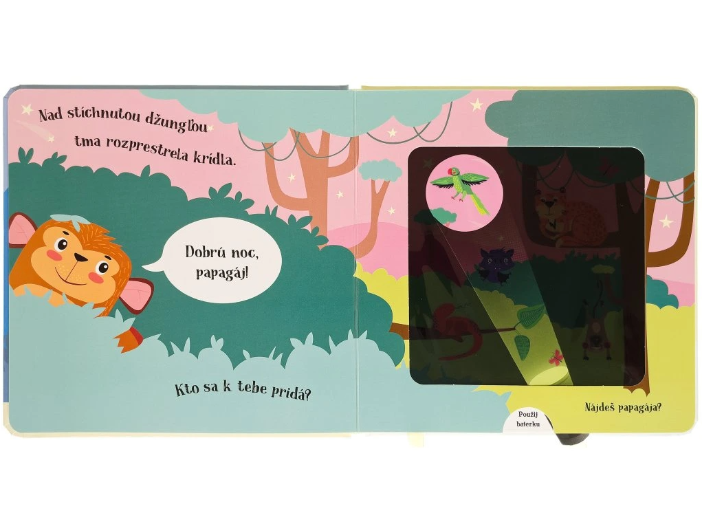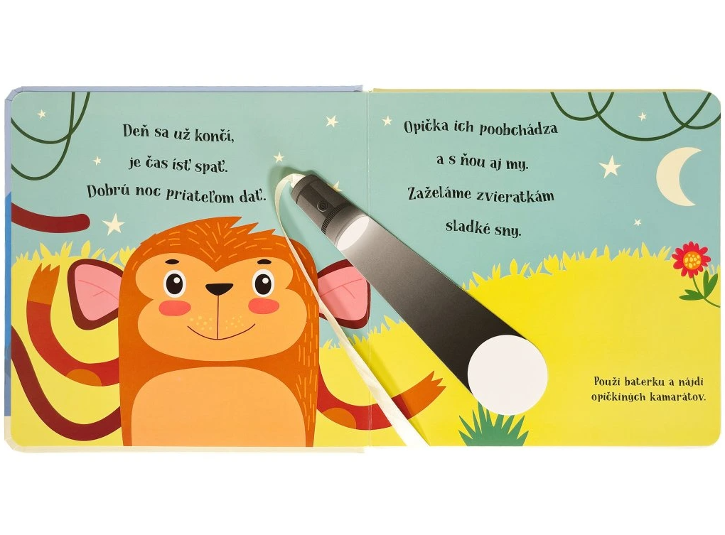 Dobrú noc, opička!Kúzelné čítanie na dobrú noc pre detiMalá opička už sa chystá spať, ale najprv musí dať dobrú noc všetkým svojim zvieracím kamarátom. Pomôžeš jej nájsť ich? Kniha s kúzelnou baterkouPomôž opičke pomocou kúzelnej baterky nájsť všetkých jej zvieracích kamarátov, ukrytých v knižke. Čítanie vo veršoch, ideálne do postieľok. Vsuň kúzelnú baterku medzi stránky a zisti, kto sa ukrýva v každej ilustrácii zobrazujúcej noc. Text vo veršoch učí deti vnímať prirodzený rytmus reči. Šikovne vyrobené okienka umožňujú deťom hľadať schované zvieratká pomocou priloženej kartónovej pomôcky v tvare svietidla. Ponúknite dieťaťu pred spaním nejakú upokojujúcu aktivitu. Táto knižka je na to priam stvorená.