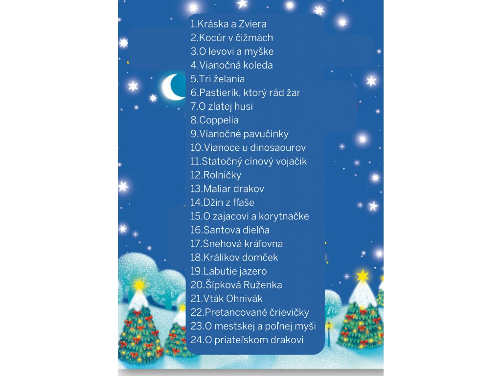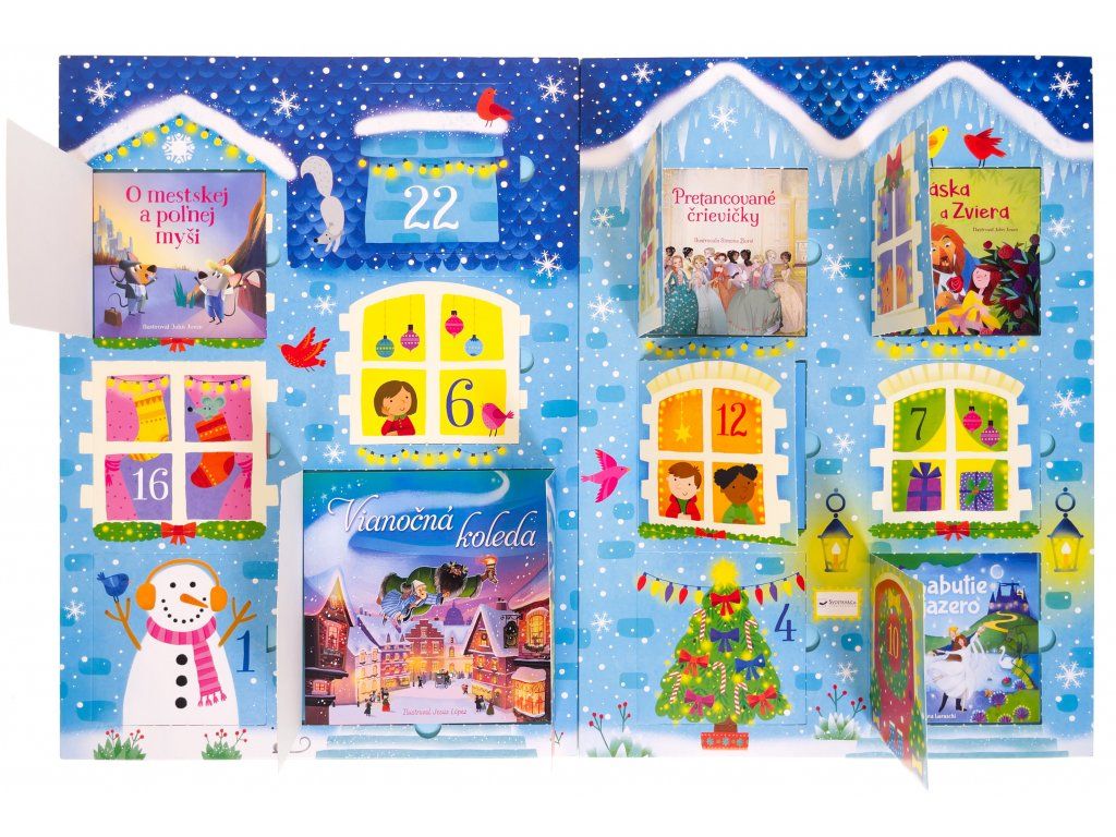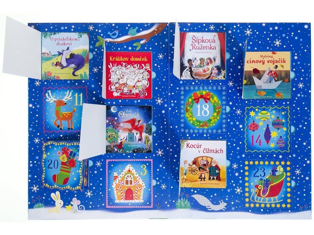 Ako si čo najviac spríjemniť čakanie na Ježiška? Pomôže rozprávkový adventný kalendár pre deti! Tešenie sa na Štedrý deň už nikdy nebude také dlhé. Predstavte si, akú radosť budú mať vaše deti, keď každý deň pred Vianocami objavia vo vianočnom adventnom kalendári pre deti namiesto čokolády jednu rozprávkovú knižku. Presne tak, v luxusnom darčekovom balení na vás čaká adventný kalendár a jeho knižky pod okienkami. V okienkach na teba čaká 24 malých rozprávok na každý deň. Nájdete tu dvadsaťštyri rozprávkových príbehov! Sú medzi nimi klasické rozprávky z tradičných ľudových rozprávaní a tiež príbehy od svetovo preslávených autorov ako H. Ch. Andersen alebo bratov Grimmovcov. Medzi knižkami v adventnom kalendári sa schovalo aj niekoľko vianočných básní. Kde sa ukrývajú? To je práve to prekvapenie! Textom vdýchli život rozliční ilustrátori, takže sa môžete tešiť na skutočne pestrú paletu príbehov. Len si to predstavte - začína december a vy doma otvoríte s deťmi každý večer jedno okienko a prečítate si spoločne knižku. Vďaka detskému adventnému kalendáru s 24 knihami sa u vás v rodine zrodí úplne nová, magická predvianočná tradícia.