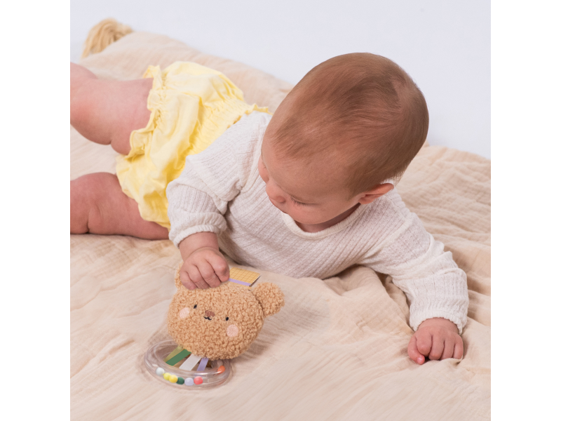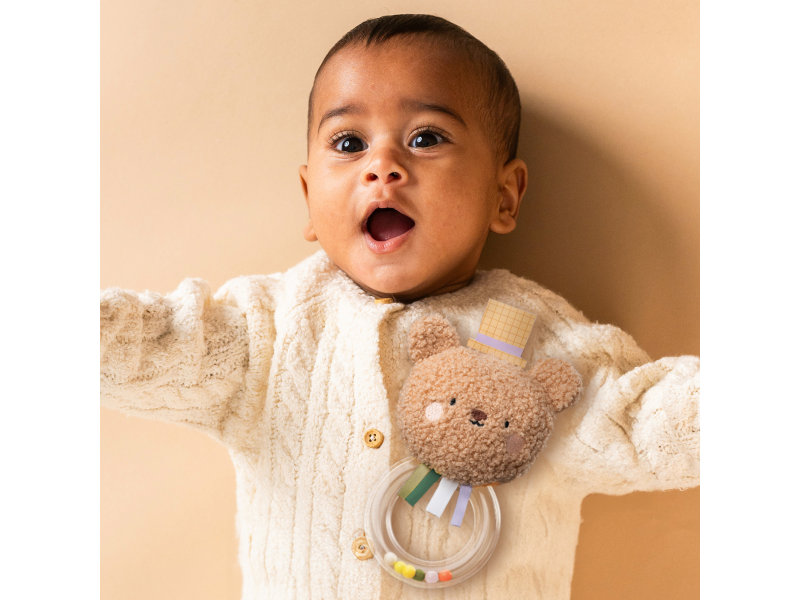 Chrastítko tvoří měkká plyšová hračka ve tvaru roztomilého medvídka Brendona a průhledný plastový kroužek naplněný barevnými korálky.  Různé tvary a povrchy hračky podněcují dítě ke zkoumání rukama i ústy a pomáhají rozvíjet jemnou motoriku a smysly dítěte. Vhodné pro děti od narození.