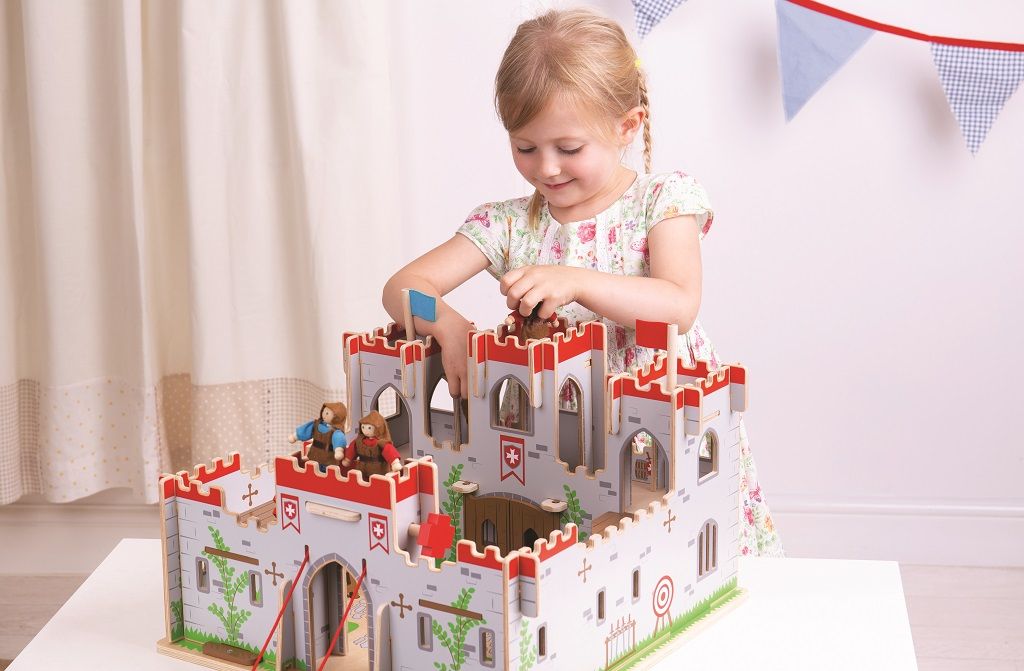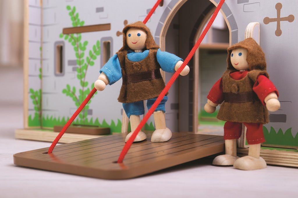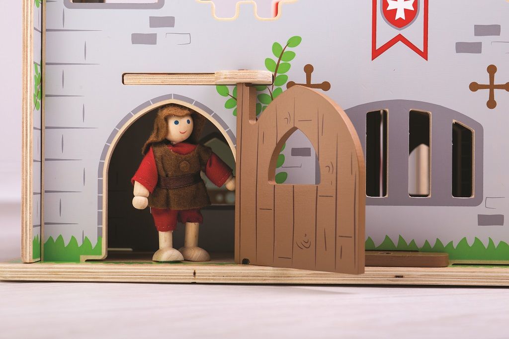 Dřevěný hrad krále George obsahuje plně funkční padací most, balkóny a pohyblivé dveře. Najdete zde i tajné dveře, kterými rytíři vyklouznou ven bez toho, aby je spatřil nepřítel! Mějte hrad pod kontrolou díky padacímu mostu, vyměňujte červené a modré vlajky podle toho, kdo hrad dobyl. Užívejte si magickou hru, nezapomeňte ale být stále ve střehu! Jednoduše složte dřevěné dílky do sebe a dobrodružství může začít. Je to skvělý způsob jak rozvíjet vypravěčské dovednosti, slovní zásobu a zručnost u dětí. Vyrobeno z kvalitních materiálů z odpovědných zdrojů. Postavičky nejsou součástí balení, lze je dokopit.  Hlavní vlastnosti: funkční padací most, otevírací dveřevyměnitelné vlajkyrozvíjí komunikační dovednosti, zručnost a představivostjednoduchá montáž