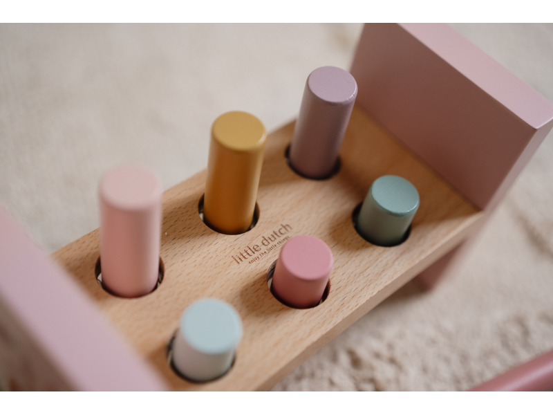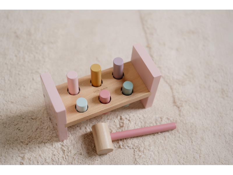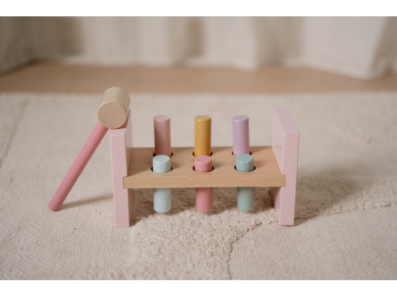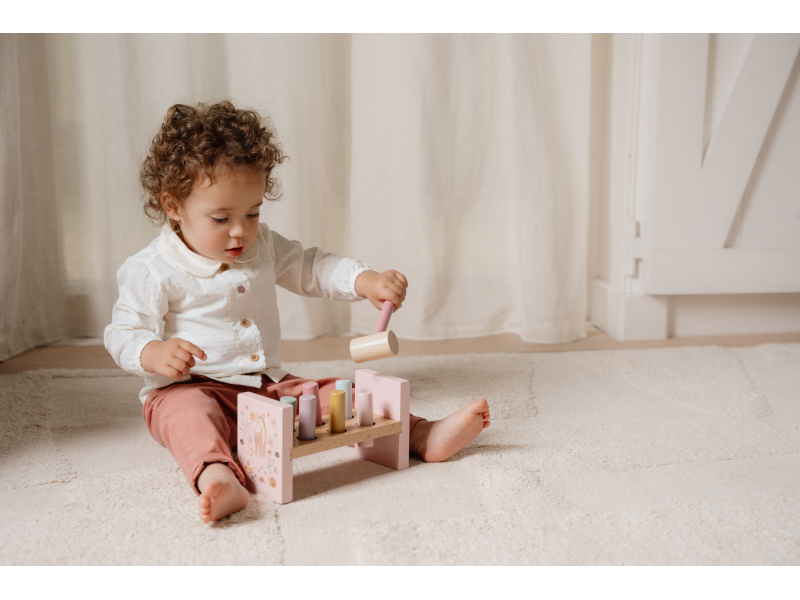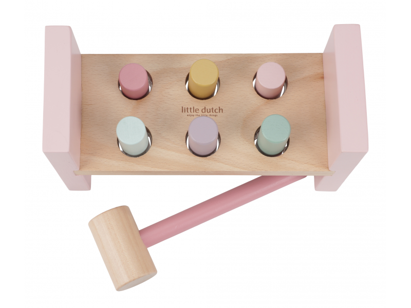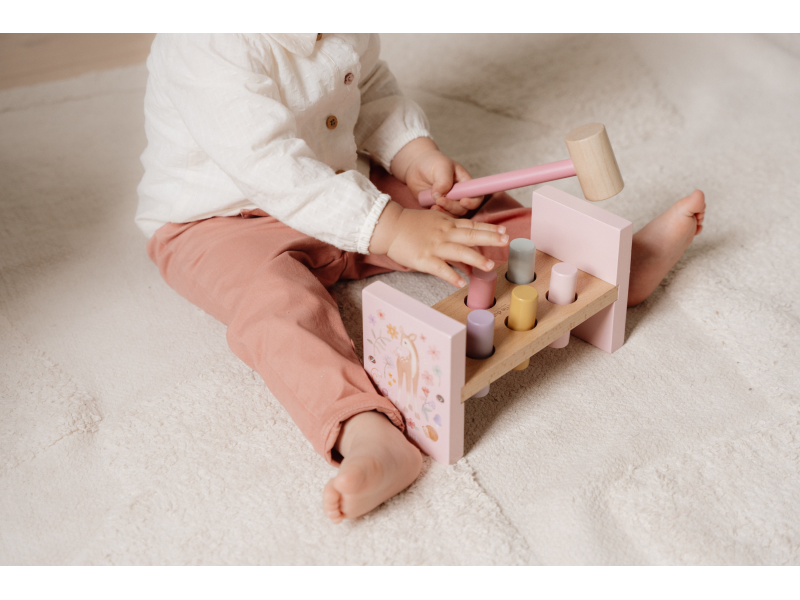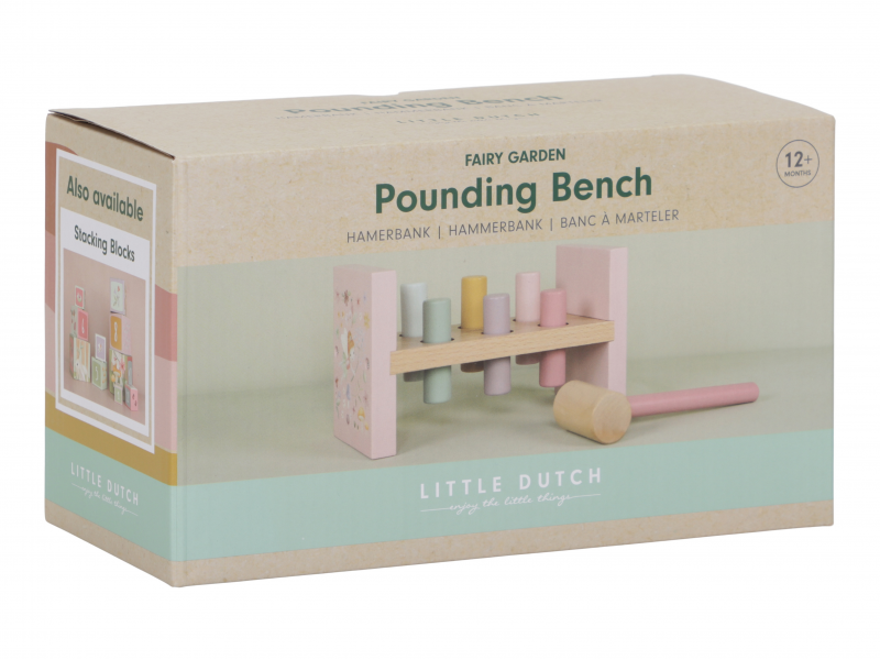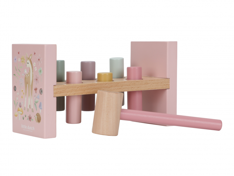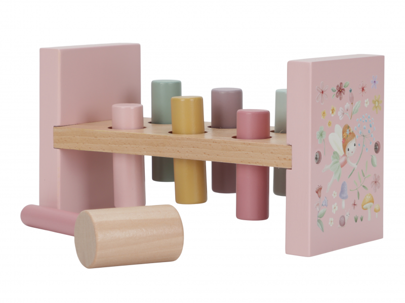 Klep sem, klep tam! Trefí vaše dítě všechny kolíčky? Pomocí kladiva je potřeba zatlouct 6 barevných kolíků do dřevěného stojanu. Až se to podaří, stačí stojan otočit a začít znovu! Můžete zatloukat pořád dokola! Hračka pomáhá rozvíjet jemnou motoriku vašeho dítěte. Zatloukačka je součástí designové kolekce hraček a doplňků Little Dutch Fairy Garden inspirované životem na zahradě.  Rozměry: 23 x 16 x 11,5 cm Vhodné pro děti od 12 měsíců.
