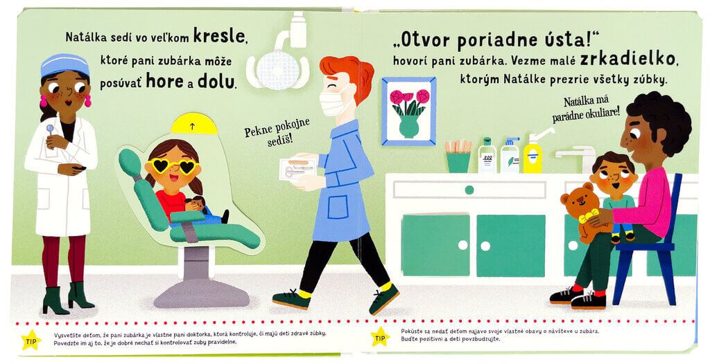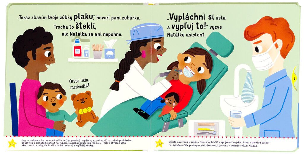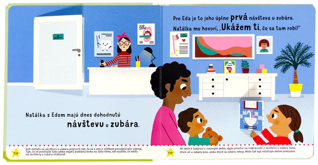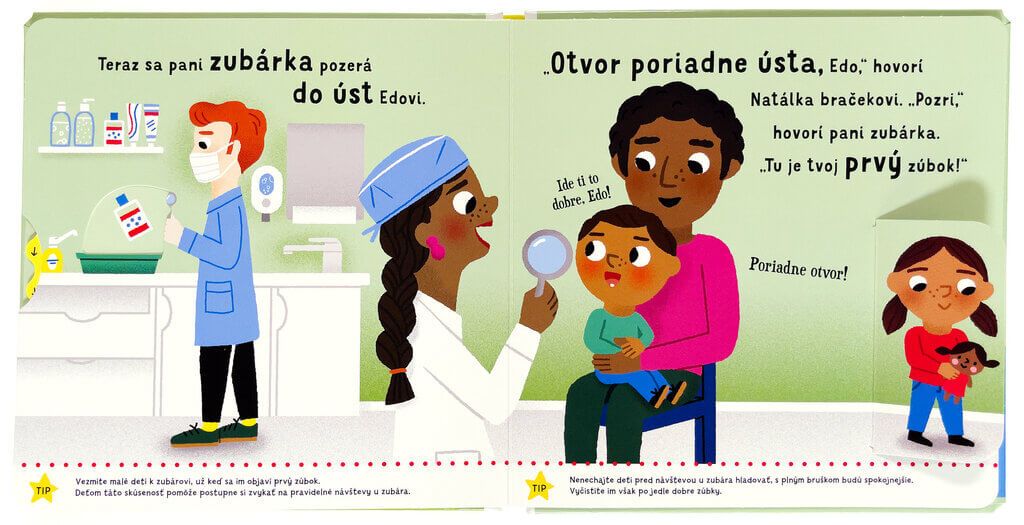Ideme k zubárovi - Veľký pokrokKrátky príbeh o Edovi pomôže deťom s návštevou u zubára.Edo dnes ide úplne prvý krát k zubárovi, zato jeho staršia sestra Natálka už u zubára bola a ničoho sa nebojí! S pomocou tejto knihy môžete deťom ukázať, že pána zubára či pani zubárky sa netreba báť. Kniha obsahuje obľúbené pohyblivé prvky, ale aj odborné rady pre rodičov a vychovávateľov.Na každej dvojstrane nájdete radu, ako pomôcť s prípadným strachom zo zubára či ako deti previesť ich prvou návštevou. Návšteva zubára nie je nič hrozné a zubári sú tu hlavne na to, aby nám pomáhali a starali sa o naše zúbky.