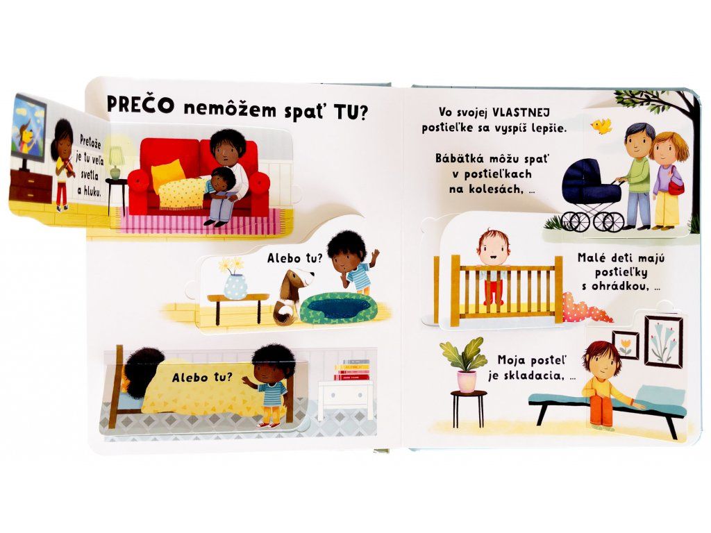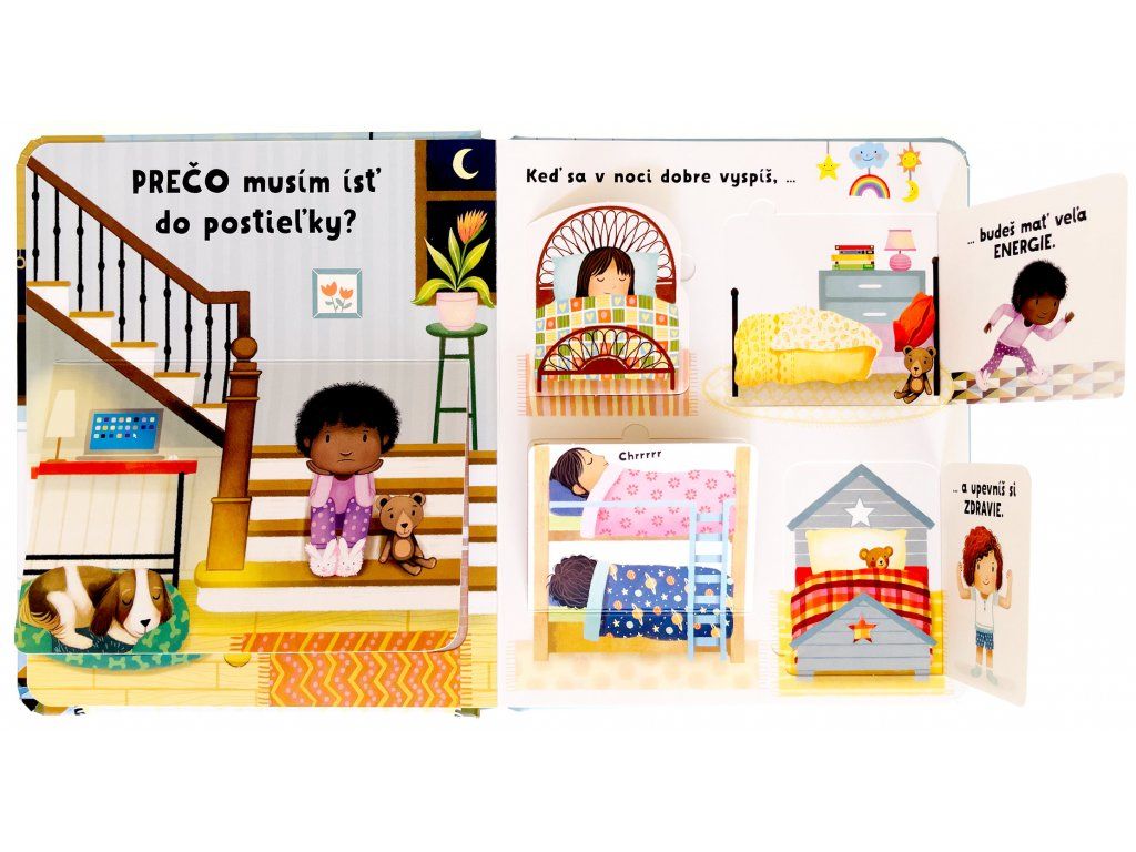 Prečo musím ísť spať?Kde spia zvieratká? Na čo je dobré zdriemnuť si? A prečo je tma, keď ideme spať?Leporelo s odklápacími okienkami jednoducho a zrozumiteľne vysvetľuje, prečo je spánok pre telo i myseľ dôležitý, a tiež pomôže s radami, čo robiť pred spaním. Vďaka leporelu bude príprava na spánok a zaspávanie vašou príjemne strávenou spoločnou chvíľou.Táto ilustrovaná knižka s odklápacími okienkami zrozumiteľnou formou deťom vysvetľuje, prečo je spánok neoddeliteľnou súčasťou každého dňa. Vysvetľuje, prečo je dôležité dbať na pravidelný a poriadny spánok, prečo je naša postieľka pre spánok to najlepšie miesto, a tiež uvádza rady, čo je dobré robiť pred spaním. Nahliadneme i do ríše zvierat a zistíme, ako spia a čo je pre ne najlepšie.