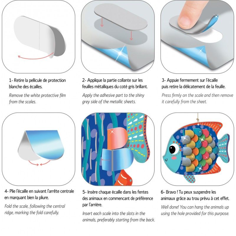 Tvorenie so šupinami Morské tvory 3+Vytvor si lesklé zvieratká!Kreatívna súprava pre deti Tvorenie so šupinami Morské tvory od francúzskej značky Crea Lign z radu Jednoduché obrázky je vhodná už pre deti od 3 rokov. Obsahuje 3 zvieratká z tvrdého kartónu, 64 šupín na nalepenie a 6 hárkov s metalickými farbami. Vďaka nim si deti zvieratká jednoducho dotvoria a vzniknú im originálne 3D obrázky, ktoré si zavesia na stenu. S Crea Lign sa deti učia nové umelecké technikyDeti najskôr odlepia šupinu, položia ju na papier s metalickou farbou, kde získa svoj jedinečný lesk, následne ju nalepia na obrázok. Súprava podporuje rozvoj jemnej motoriky, predstavivosti i kreativity. Produkt je vysoko kvalitný a bezpečný, rovnako ako všetky ostatné výrobky francúzskej značky Crea Lign.