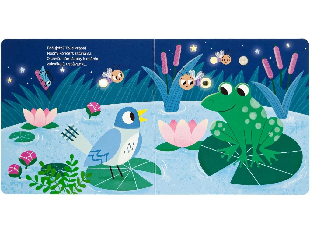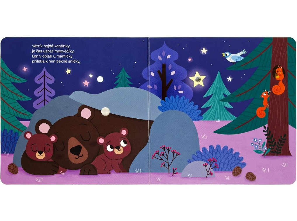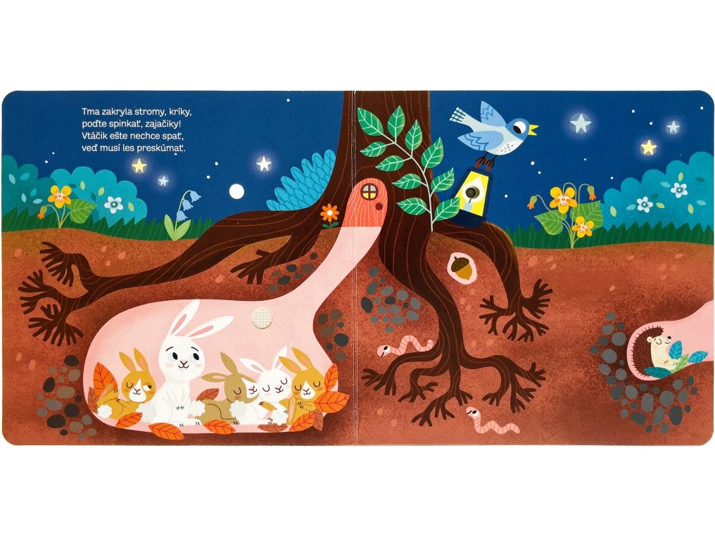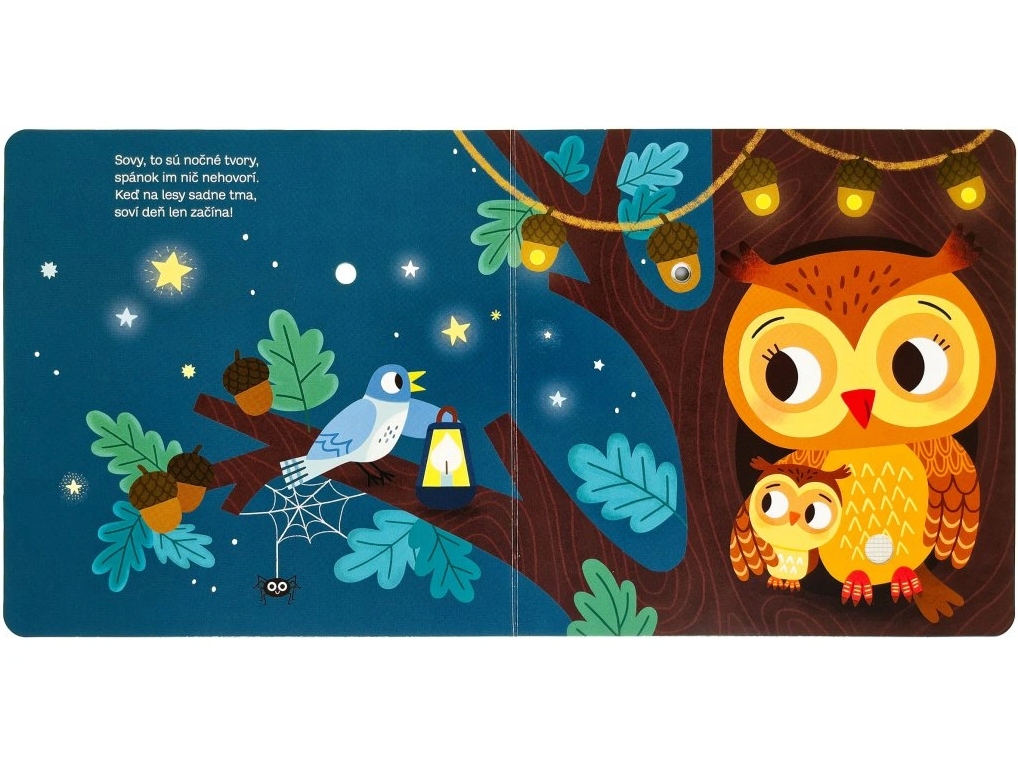 Nastáva noc a niektoré lesné zvieratká sa ukladajú na spánok.Na nočnej oblohe vyšli prvé hviezdy a lesné zvieratká sa chystajú spať. Keď sa v listnatom lese zošerí a oblohu nad stromami prežiaria hviezdičky, zaletí malý vtáčik zaželať dobrú noc všetkým svojim zvieracím kamarátom. Za svitu mesiaca uvidí báječné veci. Poď si ich aj ty pozrieť a vypočuť! Nechaj sa ukolísať k spánku aj ty s touto veršovanou knihou so zvukmi a blikajúcimi svetielkami.Vydaj sa do lesa s touto veršovanou zvukovou knihou s blikajúcimi svetielkami a zisti, ktoré zvieratká išli spať a ktoré sa naopak prebúdzajú. Spoločne si prečítajte milé verše, posvieťte si na zvieratká a nechajte sa pomaly ukolísať k spánku.