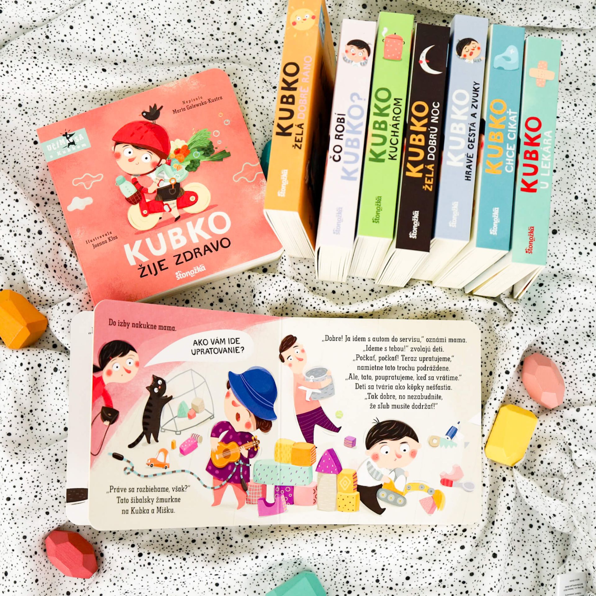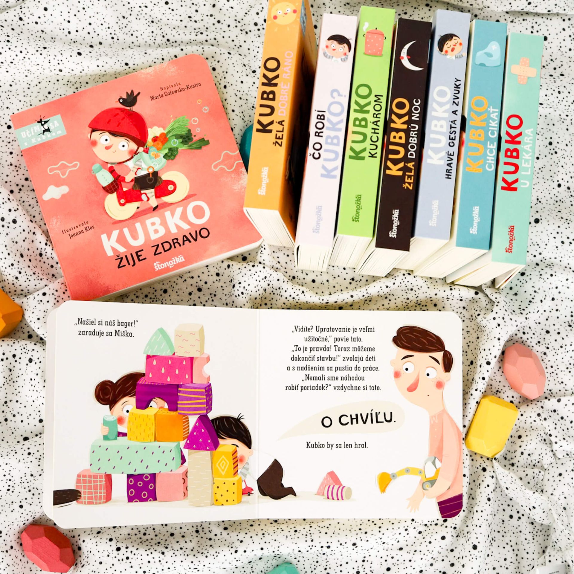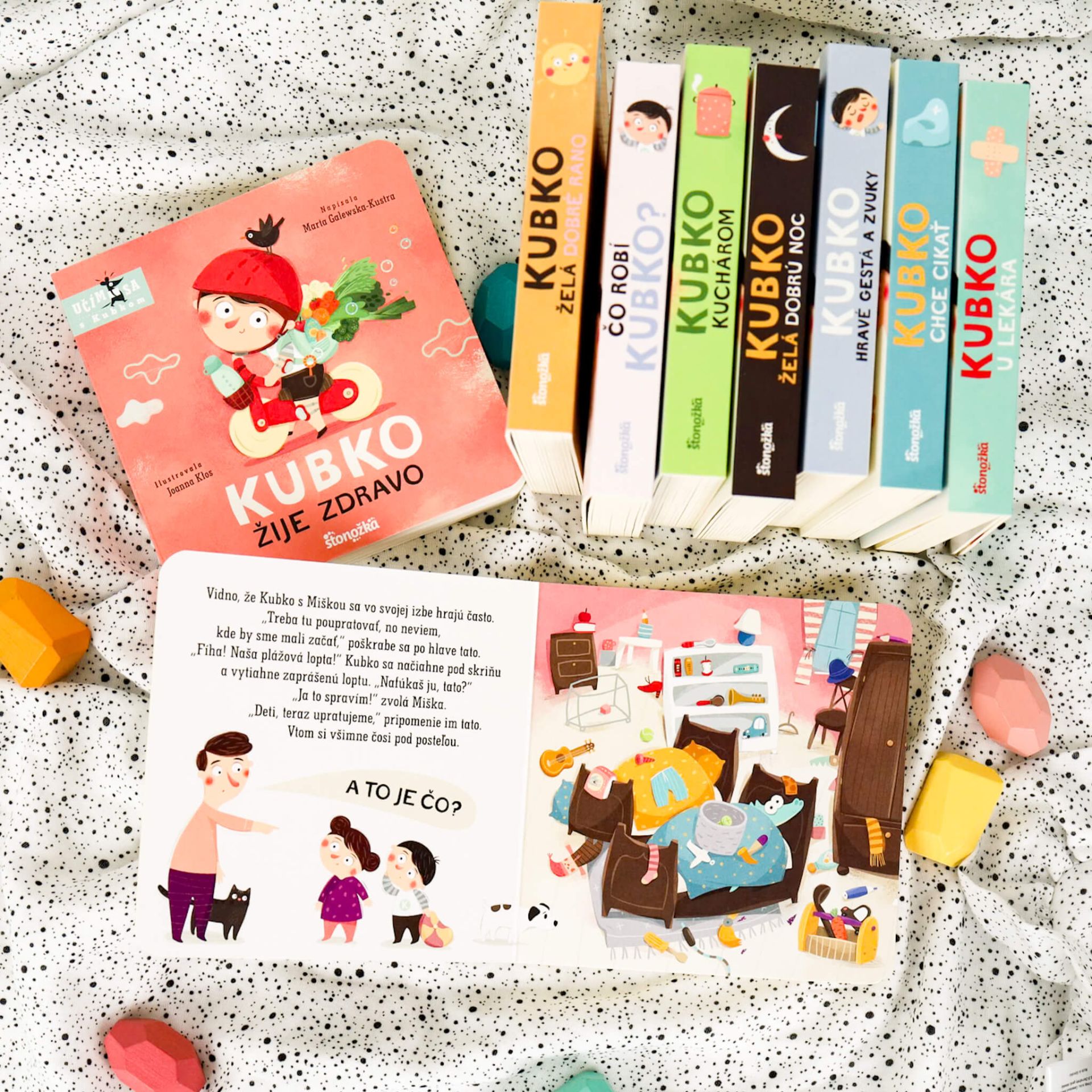 Kubko upratujeV Kubkovej a Miškinej izbe to vyzerá ako po výbuchu bomby.A tak musí zasiahnuť tato. Lenže deti sa nevedia sústrediť, lebo pri upratovaní nachádzajú dávno stratené hračky, s ktorými sa musia okamžite zahrať. Keď však v debničke s náradím chýba kľúč, ktorý Kubko súrne potrebuje, je jasné, že poriadok v dielni je základ. Treba si vyhrnúť rukávy a pustiť sa do práce. Cieľom knižky je ukázať, že upratovanie je užitočné, a nabáda deti, aby udržiavali poriadok.Leporelo má jednoduchú formu, obsahuje krásne ilustrácie a prirodzeným spôsobom zdokonaľuje detskú reč a rozvíja slovnú zásobu.