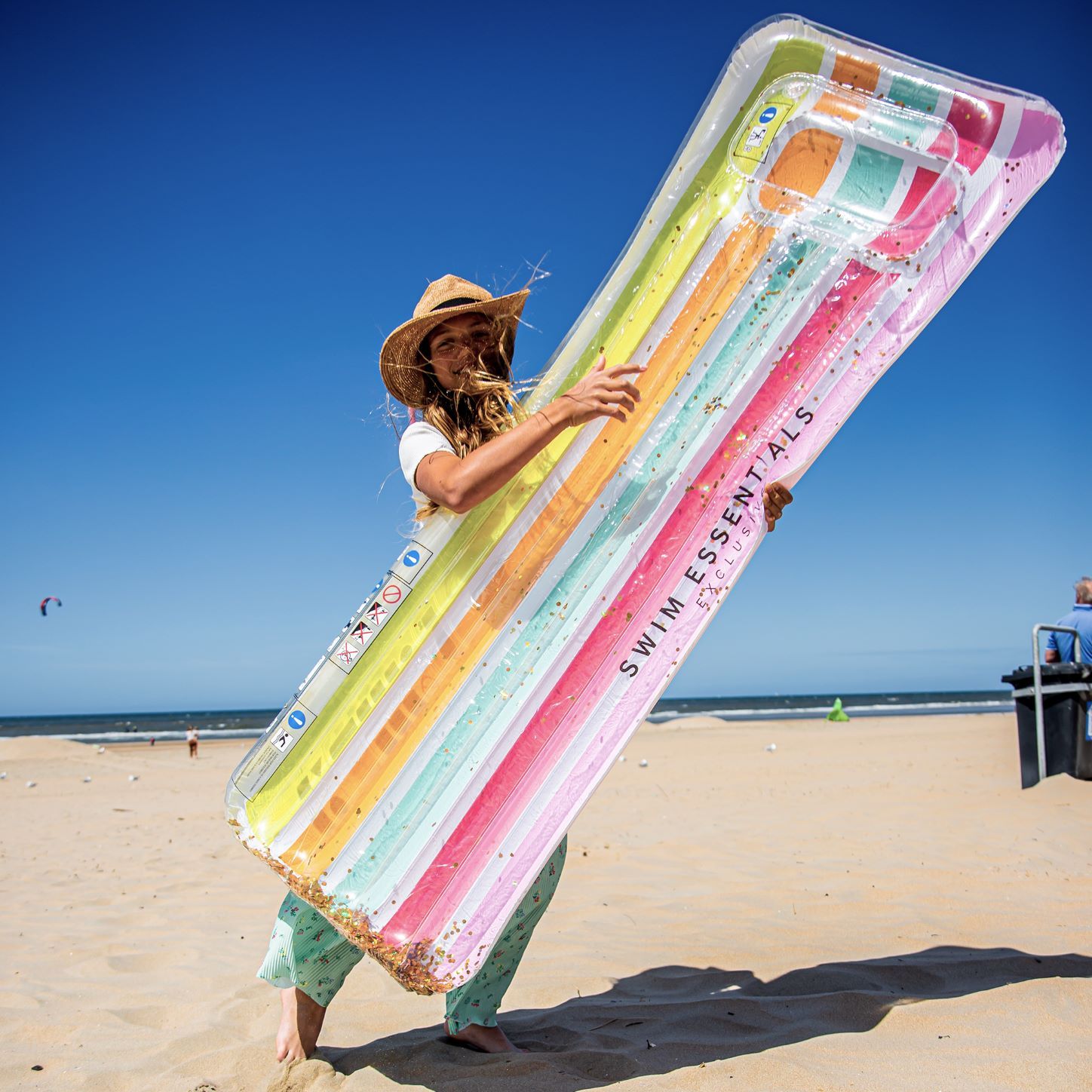 Nafukovačka Dúha s trblietkami Doprajte si originálne lehátko do vody na zábavu aj leňošenie Klasická nafukovačka od Swim Essentials v dúhových farbách s trblietkami sa bude krásne vynímať v bazéne aj na mori. Nafukovačka je maximálne pohodlná, pretože je trošku širšia ako väčšina dostupných produktov na našom trhu. Podhlavník je pekne nafúkaný a vytvarovaný pre vaše pohodlie. Je skvelá na relax, ale deti si na ňom užijú aj veľa zábavy. Vhodné pre deti aj dospelých! Je určené väčším deťom od 6 rokov s maximálnou nosnosťou do 80 kg, takže ho pokojne využijú aj teenageri či dospelí na zábavu aj leňošenie. Vďaka svojmu atraktívnemu vzhľadu a farbe bude priťahovať pozornosť všetkých na pláži. Veľkosť nafukovačky je 177 x 67 x 19 cm a má 2 nafukovacie komory. Dúhové nafukovacie lehátko vám poslúži pri mori aj v bazéne Prémiová holandská značka Swim Essentials sa pri všetkých svojich výrobkoch zameriava na vysokú kvalitu, funkčnosť a neopozeraný štýl. Aj táto priestranná nafukovačka je vyrobená z pevného a odolného PVC. Značka tiež každý rok prináša nové špičkové designy, na ktorých si dáva veľmi záležať, a dôkazom je aj táto dúhová farebnosť s trblietkami, ktoré sa krásne odrážajú na slniečku. Balenie nafukovačky je vyrobené z recyklovaného kartónu a nájdete v ňom aj jeden set na opravu prípadných dier. Nechýba ani bezpečnostné testovanie EN 25649.