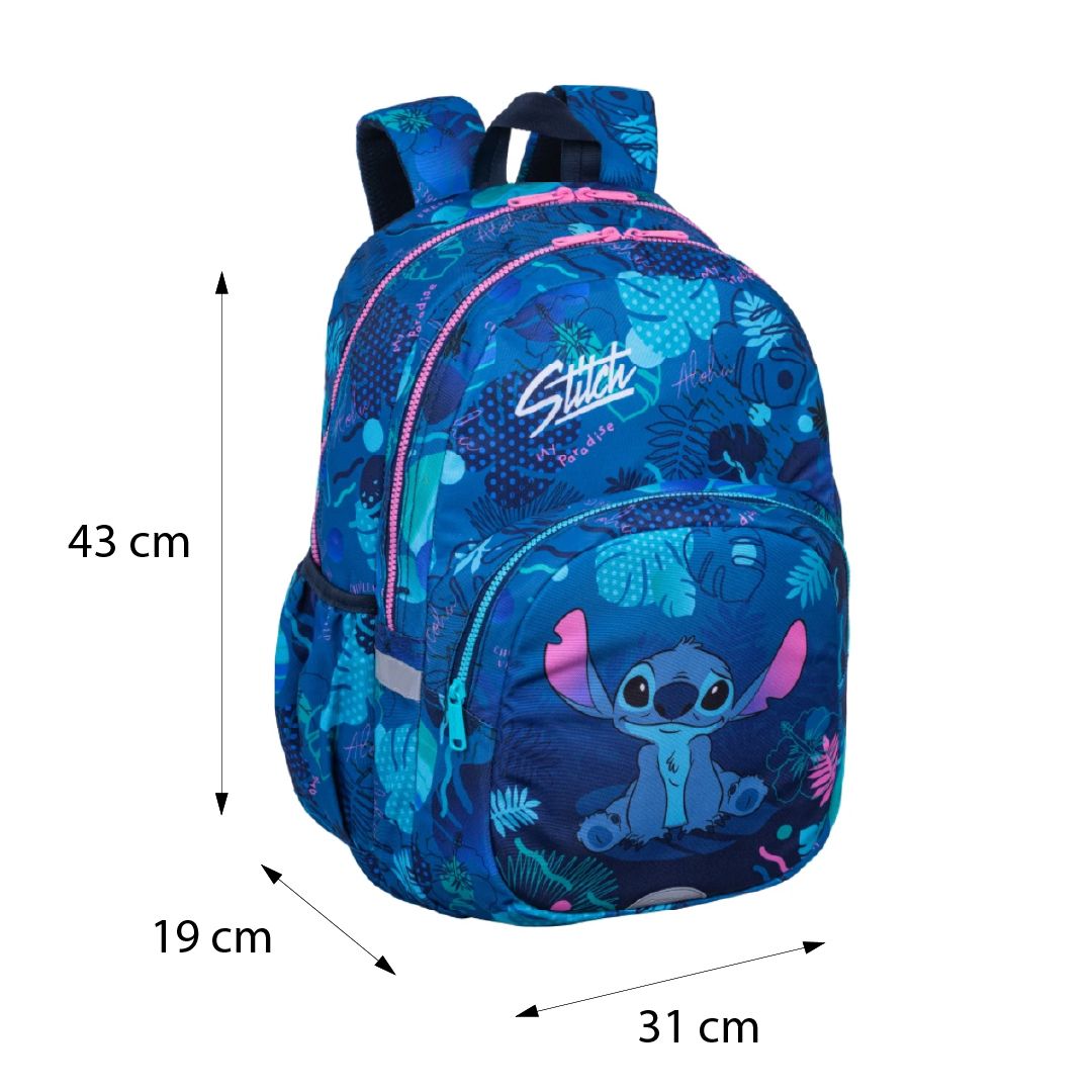 Školská taška Rider 43 cm Stitch Blue Školský batoh s inovatívnym dizajnom Školská taška Rider 43 cm Stitch Blue je dokonalým spojením štýlu, pohodlia a praktickosti. S dvoma priestrannými komorami, predným vreckom na zips a špeciálnym vreckom na notebook poskytuje dostatok priestoru na všetky potrebné veci. Nastaviteľné ramenné popruhy s mäkkou penou a vystlaný chrbát zabezpečujú maximálny komfort pri nosení, aj keď je batoh plne naložený. Pevné zipsy chránia vaše veci, zatiaľ čo zosilnená spodná časť batohu zvyšuje jeho odolnosť. Praktické vrecko na fľašu na pitie je ideálnym doplnkom pre pohodlné nosenie nápoja. Tento batoh je perfektnou voľbou pre každodenné používanie, či už do školy alebo na voľný čas. Rozmery batoha 43 x 31 x 19 cm (VxŠxH).