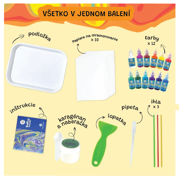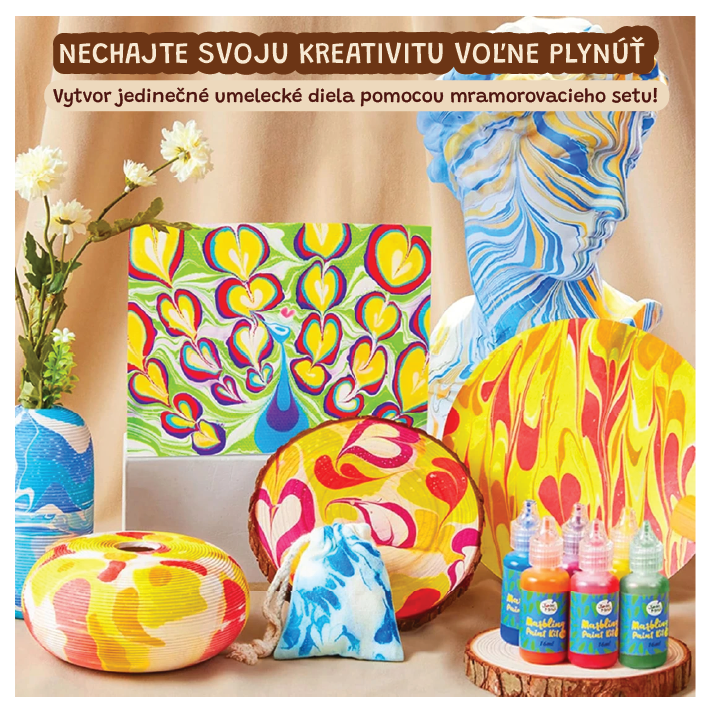 Sada na mramorovanie 6 farieb Premeň vodu na umelecké plátno! Tento magický mramorovací set od Jarmelo prináša nekonečné vzory pomocou kúzla vody a farieb. Stačí vytlačiť farbu, navzorkovať a preniesť na papier – radosť pre malé ruky i odvážnu kreativitu. Netoxické farby, minimálny neporiadok a výsledky, ktoré budú tešiť deti i rodičov.Čo obsahuje a čím deti v momente zaujme? 6 fliaš farby (16 ml), ktoré sa nádherne miešajú na vode10 špeciálnych papierov pripravených na mramorové vzoryPomôcky - miska, špachtľa, pipeta, slamka,... Netoxické a bezpečné pre deti od 3 rokovUčenie cez hru - podporuje tvorivosť, experimentovanie a precíznu motorikuVšetko umiestnené v peknej krabici – skvelé ako darček