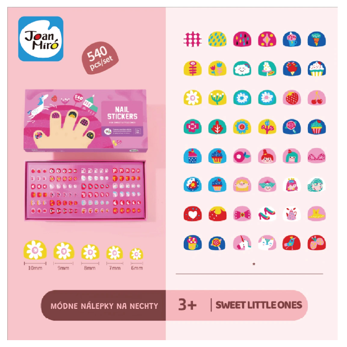 Nálepky na nechty For sweet little ones Čarovné nálepky na nechty pre malé víly a princezné Táto sada obsahuje 540 farebných nálepiek na nechty s nežnými dizajnmi zvieratiek, hviezdičiek a ďalších motívov. Nálepky sú netoxické, ideálne na pohodlné používanie aj pre citlivú detskú pokožku. Čo táto interaktívna sada ponúka? 540 nálepiek v rôznych tvaroch Vodeodolné a bez zápachu – vydržia na nechtoch 3–5 dní a jednoducho sa odstrániaEkologické farbivá, bezpečné pre deti od 3 rokov Rýchla aplikácia – nalepíte a máte hotovo, žiadne lepidlo ani komplikáciePodporuje jemnú motoriku, kreativitu a pocit sebavyjadreniaPraktický formát balenia vhodný aj na cestovanie