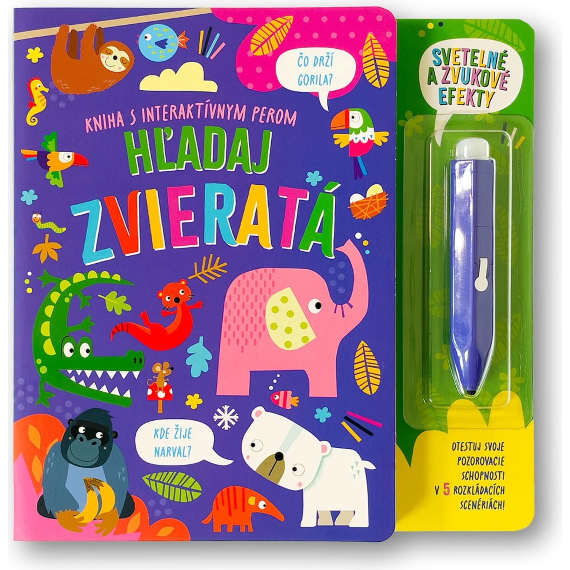Hľadaj a počúvaj ZvieratáZábavná kniha pre malých objaviteľovObjavte s vašimi deťmi fascinujúci svet zvierat pomocou interaktívnej zvukovej knihy „Hľadaj a počúvaj Zvieratá“! V každom prostredí – od farmy po džungľu – sa skrýva päť rôznych zvierat. Deti majú za úlohu ich nájsť na ilustráciách, stlačiť príslušné tlačidlo a vypočuť si zvuk, aký vydávajú.Táto kniha rozvíja: pozornosť a sústredenie sluchové vnímanie slovnú zásobu a poznávanie prírody