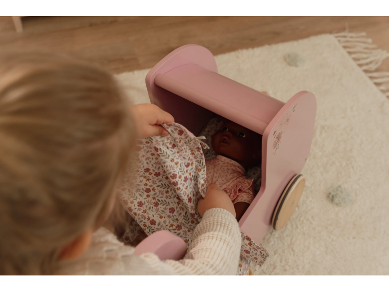 Tento nádherný dřevěný kočárek pro panenky zaujme svým retro designem a něžným květinovým potiskem. Součástí kočárku je měkký polštářek, hřejivá peřinka a pohodlná matrace – vše laděné do jemného květinového designu. Ideální volba pro malé pečovatelky i pečovatele, kteří chtějí své panenky vozit stylově a pohodlně. Kočárek je díky kvalitní dřevěné konstrukci velmi stabilní. Kolečka mají po obvodu gumové kroužky, které zabrání poškrábání podlahy a umožňují nehlučnou jízdu.  Nadčasová hračka, která potěší generace dětí a poskytne spoustu radosti při hraní na rodiče. Hračka je součástí kolekce vysoce kvalitních dřevěných hraček Little Dutch, navržených s důrazem na bezpečnost a originální design. Vyrobeno z odolného FSC® certifikovaného dřeva. Rozměry: 41 x 25 x 43,5 cm Vhodné pro děti od 18 měsíců.