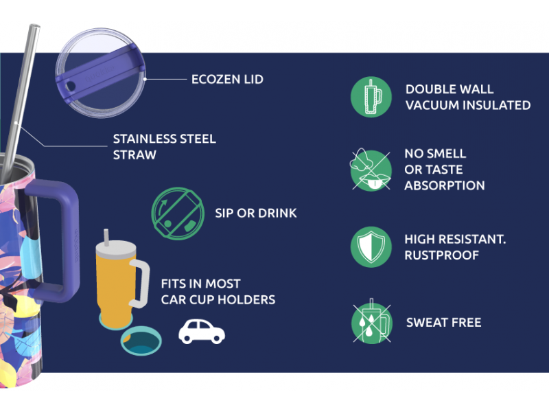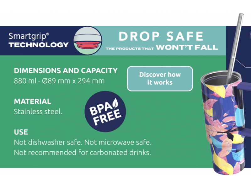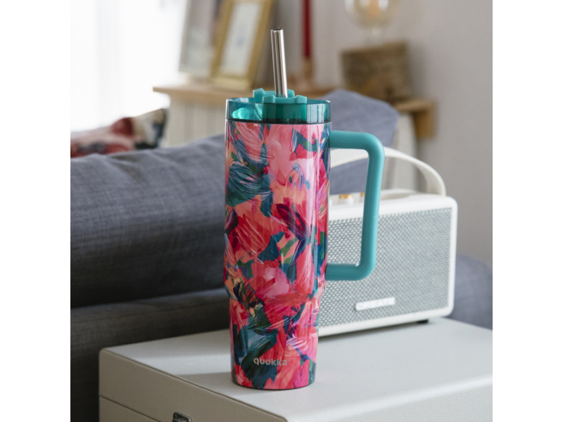 Termohrnek Quokka Vibe z vysoce kvalitní dvoustěnné oceli udrží teplotu nápoje studeného s ledem až 48 hodin, studeného až 14 hodin a teplého až 8 hodin. Termohrnek s vyjímatelným nerezovým brčkem umožňuje snadné pití bez nutnosti naklánění. Spolehlivý uzávěr z kvalitního Ecozen plastu chrání obsah před vylitím a umožňuje z termohrnku pít i bez brčka. Široké hrdlo umožňuje vložení kostek ledu a zároveň se díky němu hrnek snadno čistí.  Quokka Vibe je součástí kolekce hrnků Drop Safe se speciálním dnem Smartgrip®, které při postavení na hladký povrch brání převržení a nechtěnému vylití obsahu hrnku. Tvar termohrnku je vhodný do většiny držáků nápojů v autě. Objem: 880 ml Rozměry: 294 x 89 mm Nerezový materiál neabsorbuje pachy a neobsahuje BPA. Termohrnek není vhodný do myčky ani mikrovlnné trouby.