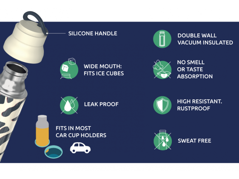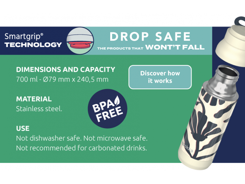 Termoska Quokka Pulse z vysoce kvalitní dvoustěnné oceli se spolehlivým, 100% těsnicím uzávěrem udrží váš nápoj dle potřeby teplý či studený. Široké hrdlo umožňuje vložení kostek ledu. Termoska udrží teplotu studeného nápoje s ledem až 48 hodin, studeného nápoje až 16 hodin a teplého nápoje až 12 hodin. Silikonové poutko, které je zakomponované do víčka láhve, usnadňuje přenášení. Quokka Pulse je součástí kolekce lahví a hrnků Drop Safe se speciálním dnem Smartgrip®, které při postavení na hladký povrch brání převržení a nechtěnému vylití obsahu láhve. Tvar láhve je vhodný do většiny držáků nápojů v autě. Objem: 700 ml Rozměry: 240 x 79 mm Nerezový materiál neabsorbuje pachy a neobsahuje BPA. Termoska není vhodná do myčky ani mikrovlnné trouby.